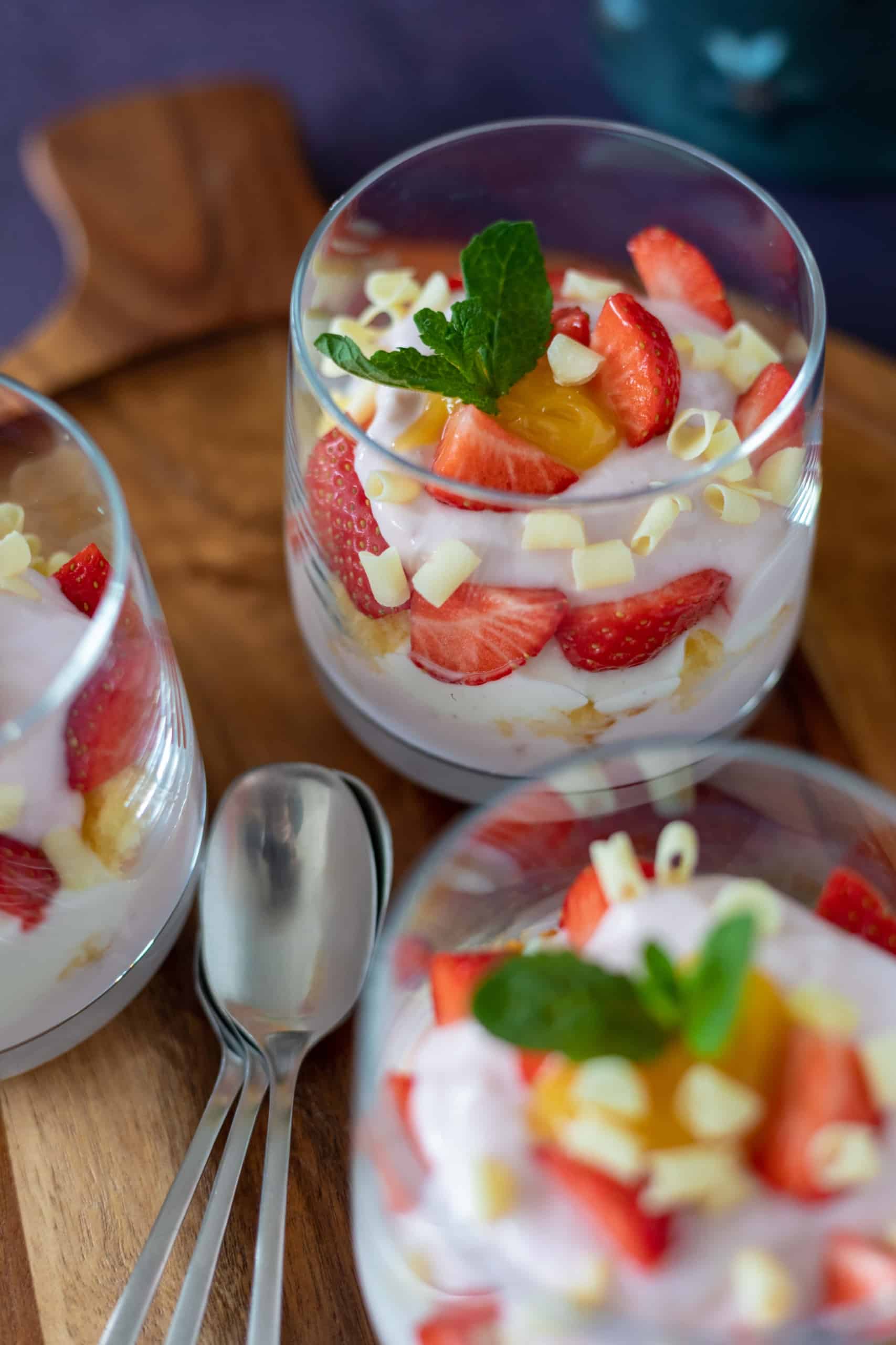- Garneer naar keuze met een lepeltje lemon curd, paar aardbeien in stukjes, wat geraspte witte chocolade (of andere sprinkles) en blaadjes verse munt.
