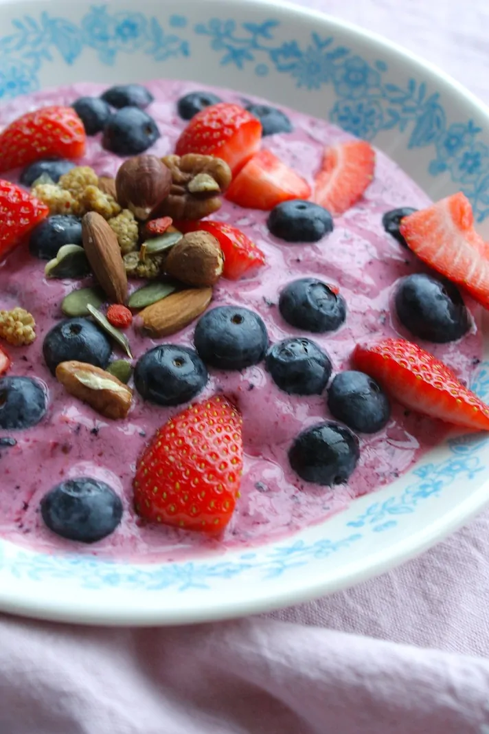 Maal het bevroren fruit met de yoghurt helemaal fijn in de blender of keukenmachine en schep over in een bakje. Versier je frozen yoghurt met vers fruit, noten, zaden, of waar je dan ook zin in hebt. En geniet 🙂