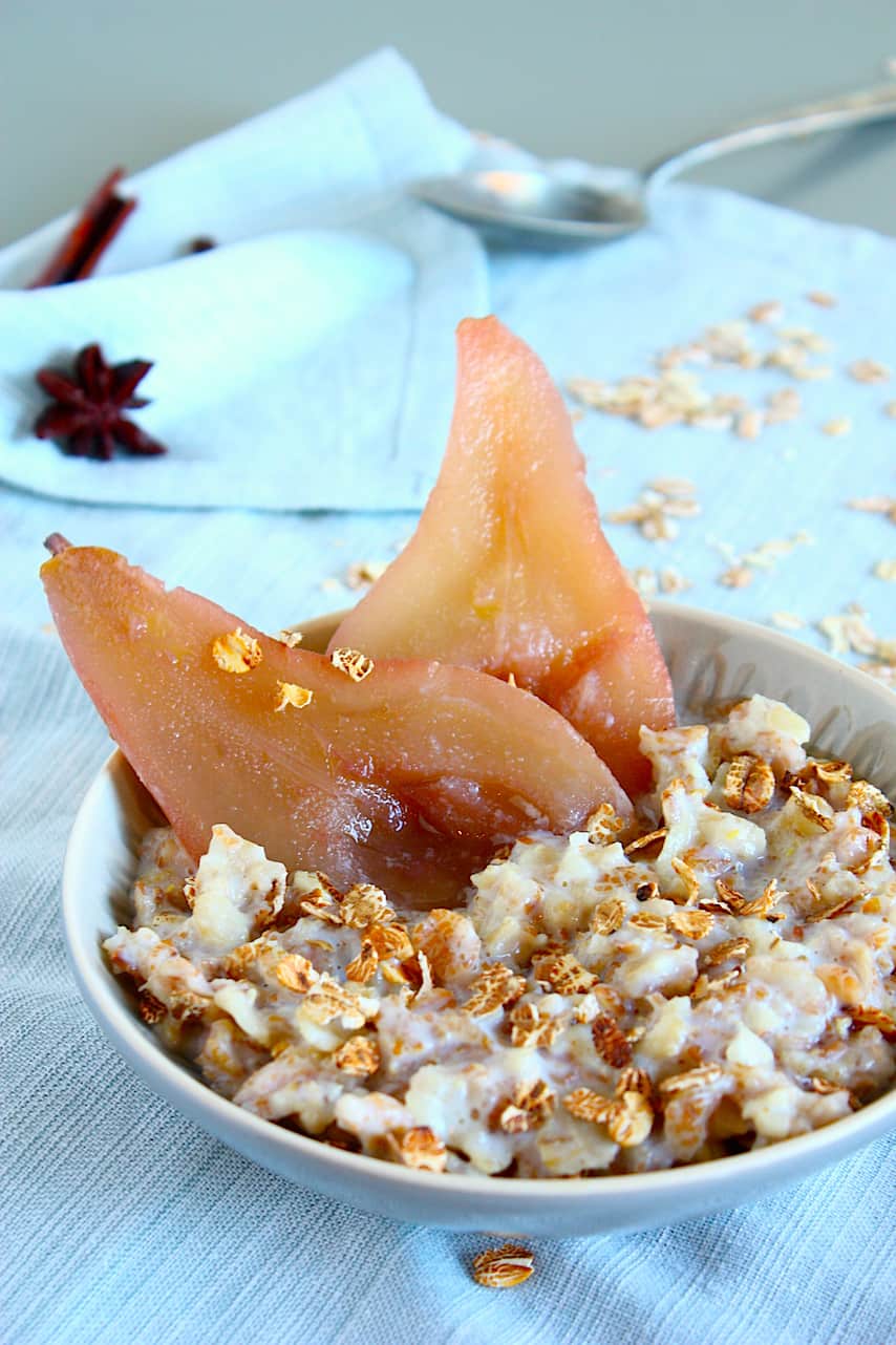 Wat me aan vroeger doet denken en ik nog steeds best lekker vind, is de klassieke pap van Brinta. Die kent iedereen wel toch? Met hun oergranen (of klassieke volkoren granen) kun je deze heerlijke ontbijtpap met gepocheerde peertjes maken.
