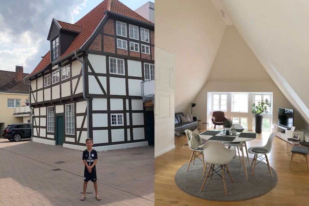Wildeshauser Speicher is een prachtig gerenoveerd vakantiehuis middenin het dorp Wildeshausen. Met veel liefde en oog voor detail verbouwd. Het is heel ruim met 2 grote slaapkamers, een enorme badkamer, een kleedkamer, 2 terrassen en (wat mij betreft de parel) een grote woonkamer en keuken op de bovenverdieping. Het heeft een bijzondere, omgedraaide indeling en daarom is er ook een goederenliftje zodat je je niet steeds een breuk hoeft te tillen met boodschappen, bagage of servies als je lekker buiten gaat eten. Alles was perfect geregeld toen we aankwamen. Tot aan opgemaakte bedden en zachte hotelhanddoeken in de badkamer. En naast het huis heb je een eigen parkeerplaats.