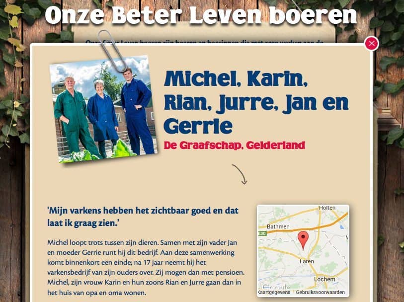 Michel antwoordt: “In Nederland zijn er zo’n 30 zichtstallen waar je altijd langs kunt gaan. Mijn boerderij is geen zichtstal en ik ben daar niet op ingericht. Verder zijn we ook gewoon een bedrijf en ik kan niet te pas en te onpas rondleidingen verzorgen als mensen onverwachts langskomen. Ik doe het graag, maar dan wel op afspraak. Verder is dit voor ons ook nieuw, we weten als varkenshouders nog niet wat we kunnen verwachten. Eerst maar even afwachten en we kunnen later altijd nog adressen toevoegen. Het heeft alleen niets te maken met het ‘verbergen’ van boeren. Want als je contact opneemt met Unox met je verzoek dan kan er altijd een afspraak bij een boer worden gemaakt.”