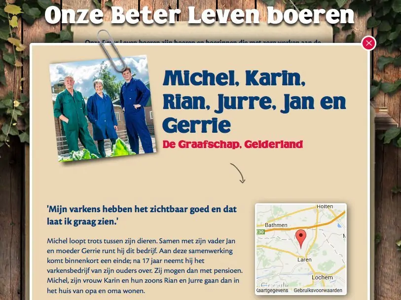 Michel is trots op zijn Beter Leven keurmerk en de samenwerking met vleesverwerker Vion en Unox. Met de nieuwe ‘Onze boeren’ campagne kan hij bijdragen aan meer openheid van en begrip voor de varkensproductie. Ja, er zijn in het verleden zaken mis gegaan, maar de keten heeft zichzelf herpakt en de boeren zijn meer met elkaar gaan samenwerken. Ze hebben het nu goed voor elkaar en dat mag ook verteld worden.