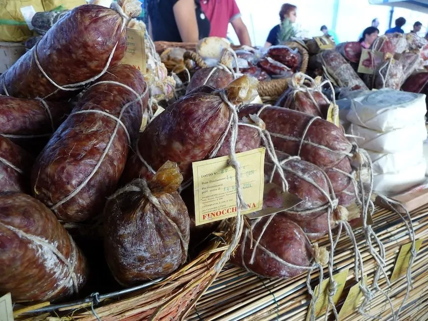 Koeien kom je bijna niet tegen in Toscane, het meeste rundvlees wordt geïmporteerd. Wat ze echter wel hebben zijn wilde zwijnen. En daar maken ze ontzettend lekkere salami van. Een traditioneel Toscaans gerecht wat ik helaas niet heb kunnen proeven is ragù di cinghiale. Pappardelle met een stevige saus van wild zwijn. Dit staat hoog op mijn verlanglijstje!