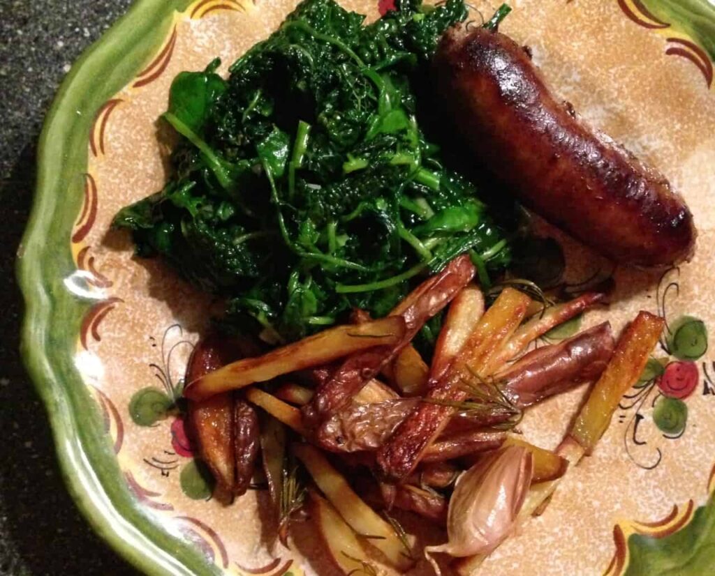 Dit is nou echt zo’n recept wat bij mij ontstaat door het leegruimen van de koelkast. Alles moet op en dat werd in dit geval heel erg lekker 🙂 Wat je nodig hebt – 250gr roodschillige of nieuwe aardappelen – 2 teentjes knoflook – 1 takje rozemarijn – 2 kalfsworsten