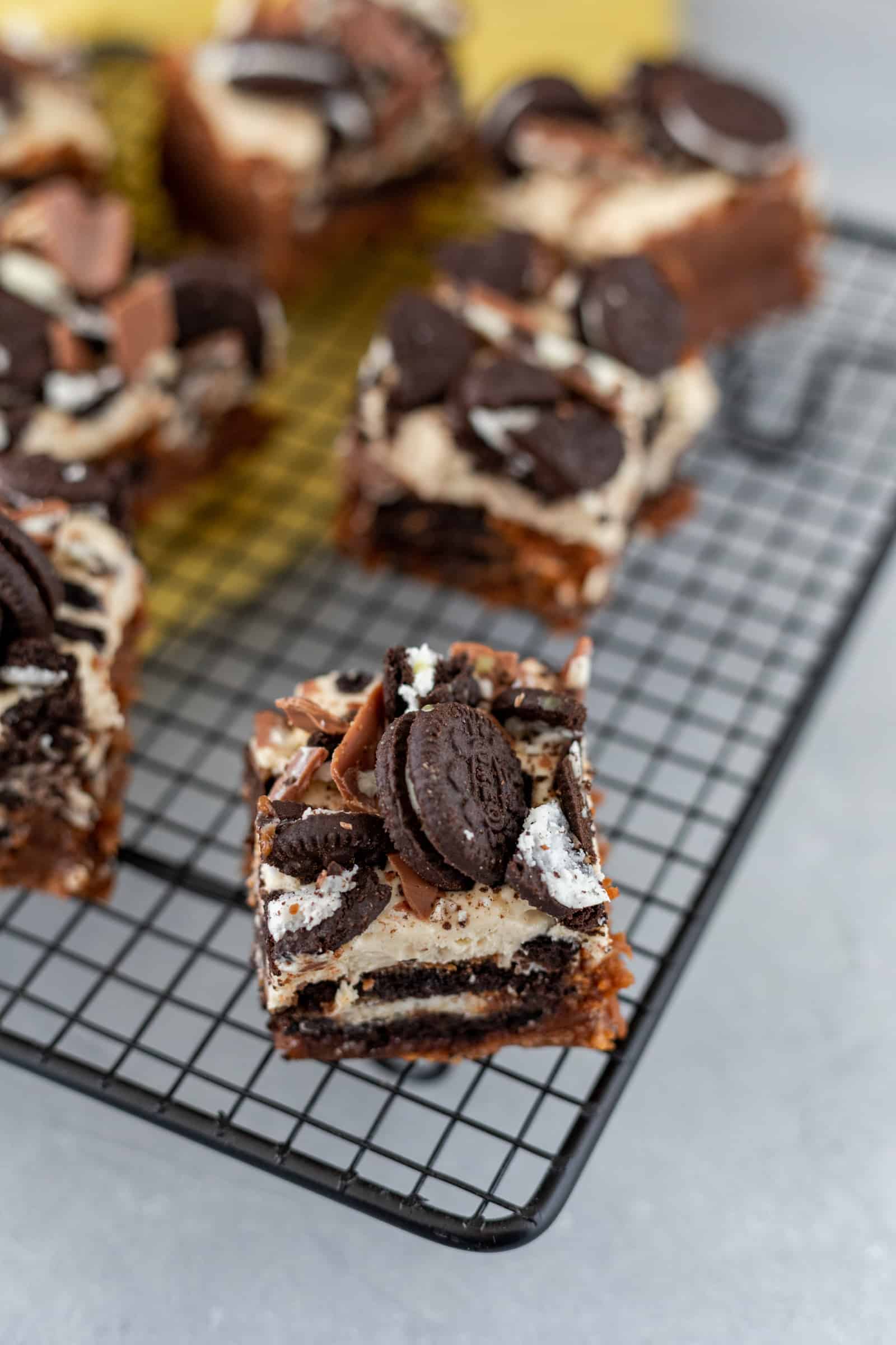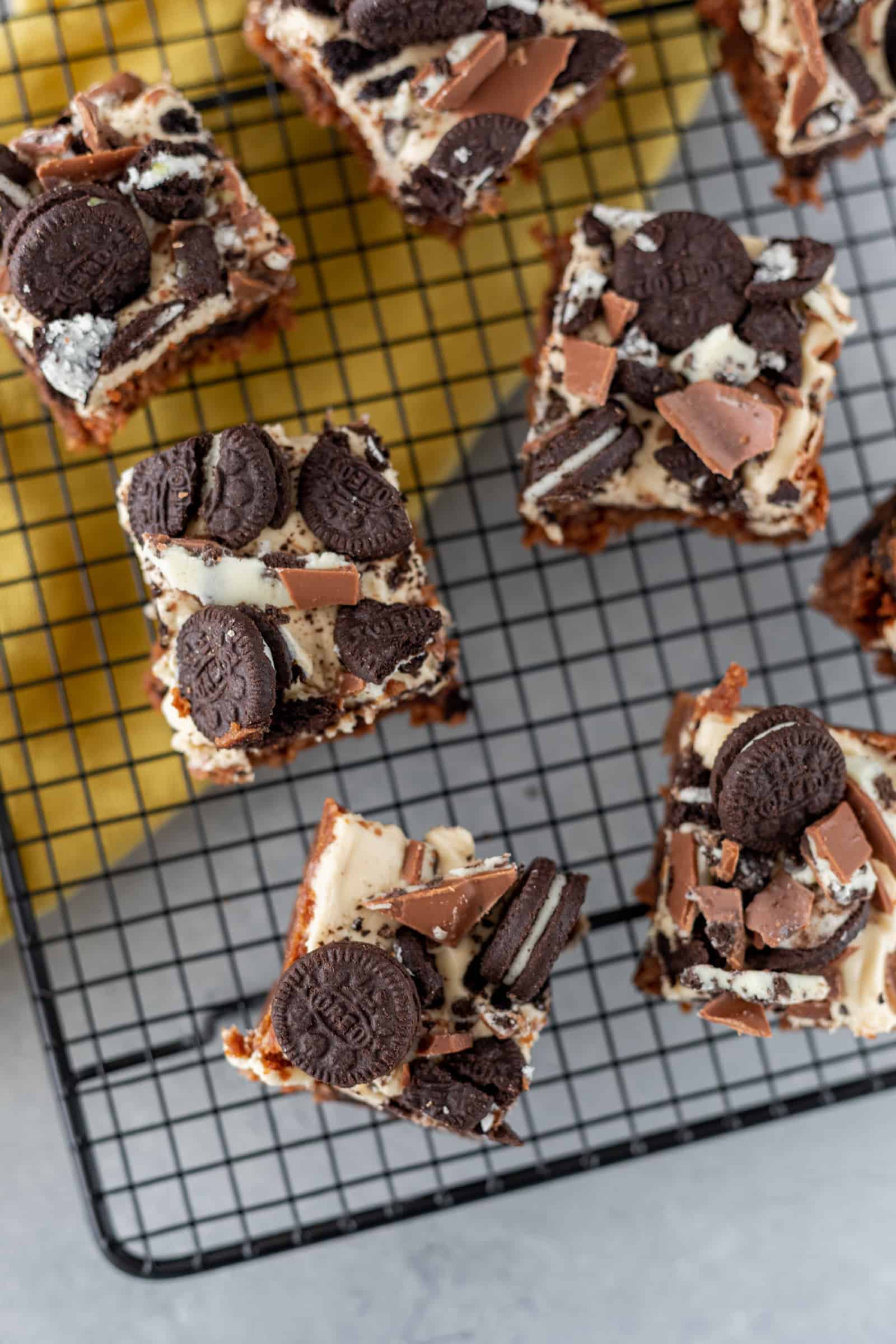 - Garneer met grof gebroken mini Oreo’s en snijd daarna in kleine vierkante stukjes. Omdat ze zo machtig zijn kun je er prima 16 stukjes van snijden, maar 12 grotere kan natuurlijk ook.