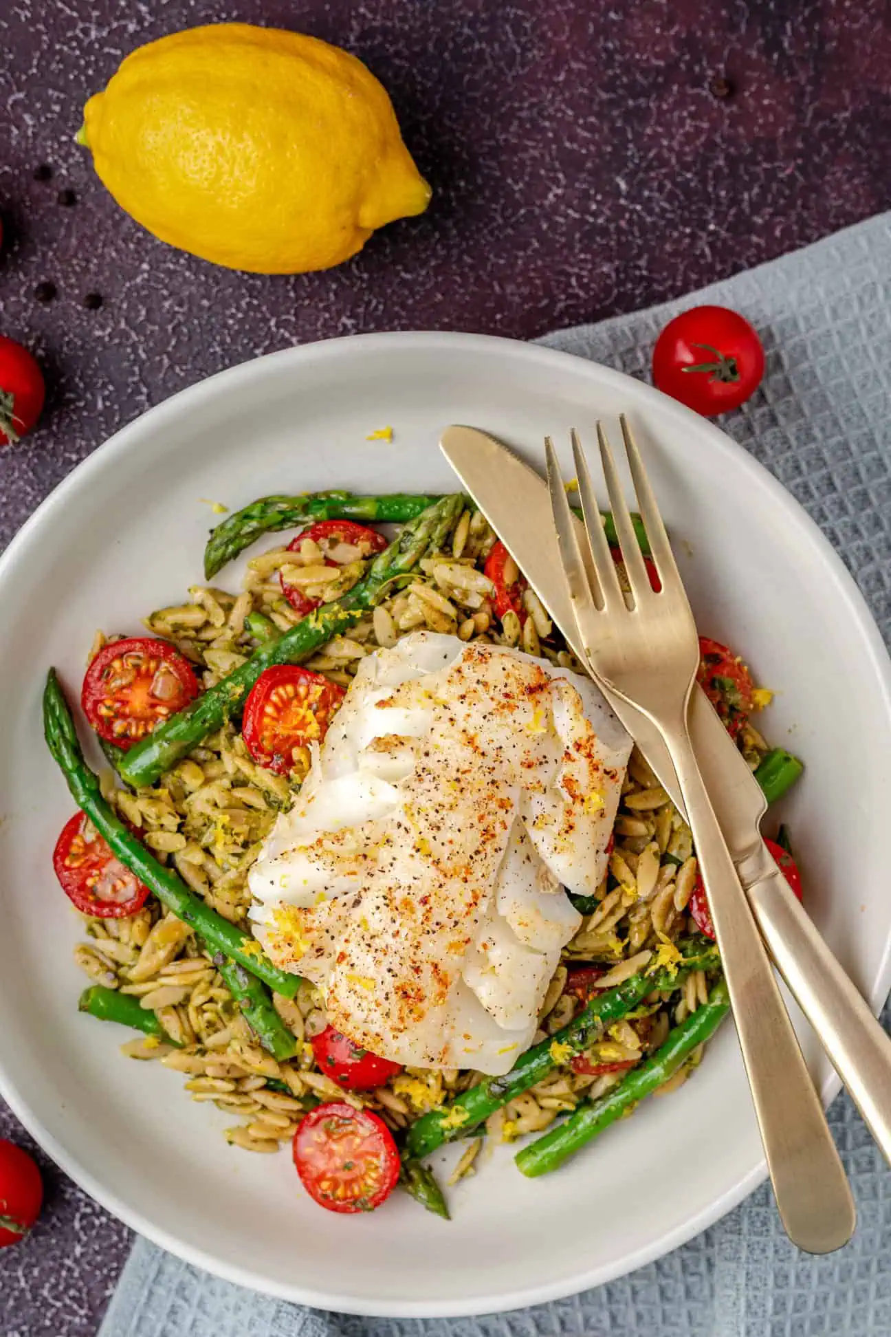In het recept vertel ik je precies hoe je deze orzo met pesto maakt en ik vertel je hoe je kabeljauw perfect zacht gaart in de koekenpan. Nou, we gaan koken! In 25 minuten ben je hiermee klaar, geniet ervan.