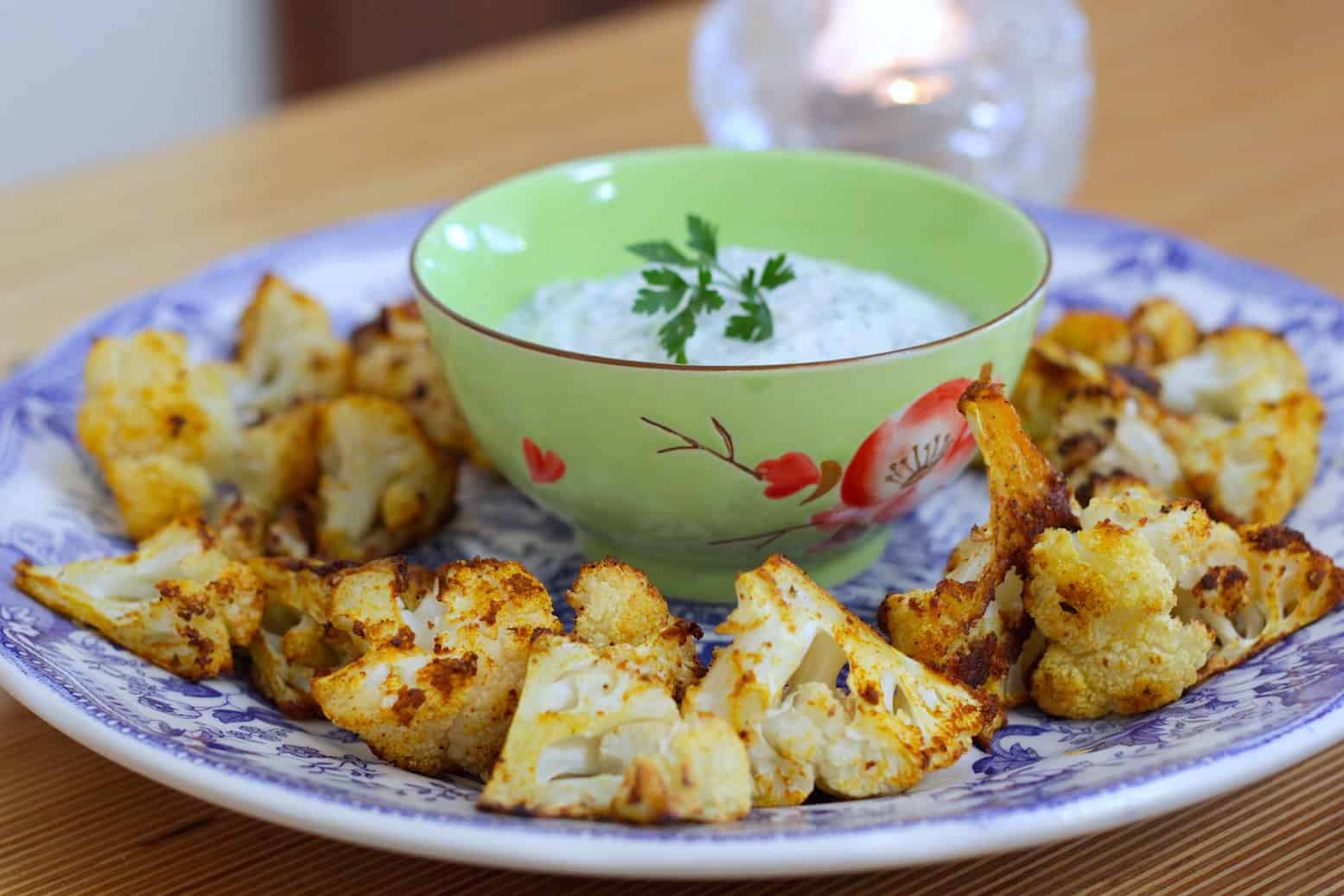 5. Haal de bloemkool uit de oven, serveer direct, lauwwarm of op kamertemperatuur (niet uit de koelkast). Met een kommetje van de dipsaus erbij.