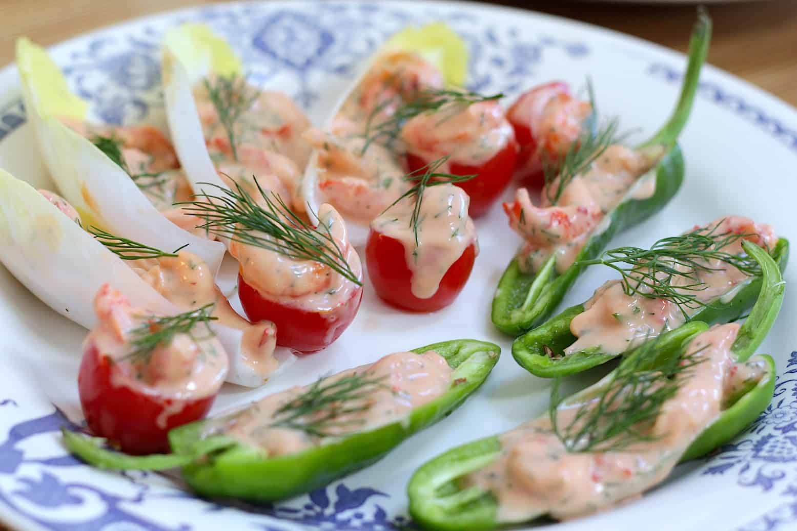 Iedereen kent de gevulde tomaatjes met garnalen wel. Dit is een variant daarop met rivierkreeftjes en paprikaatjes. We maakten in het filmpje ook nog varianten met witlof, tomaatjes en pimientos de padron.