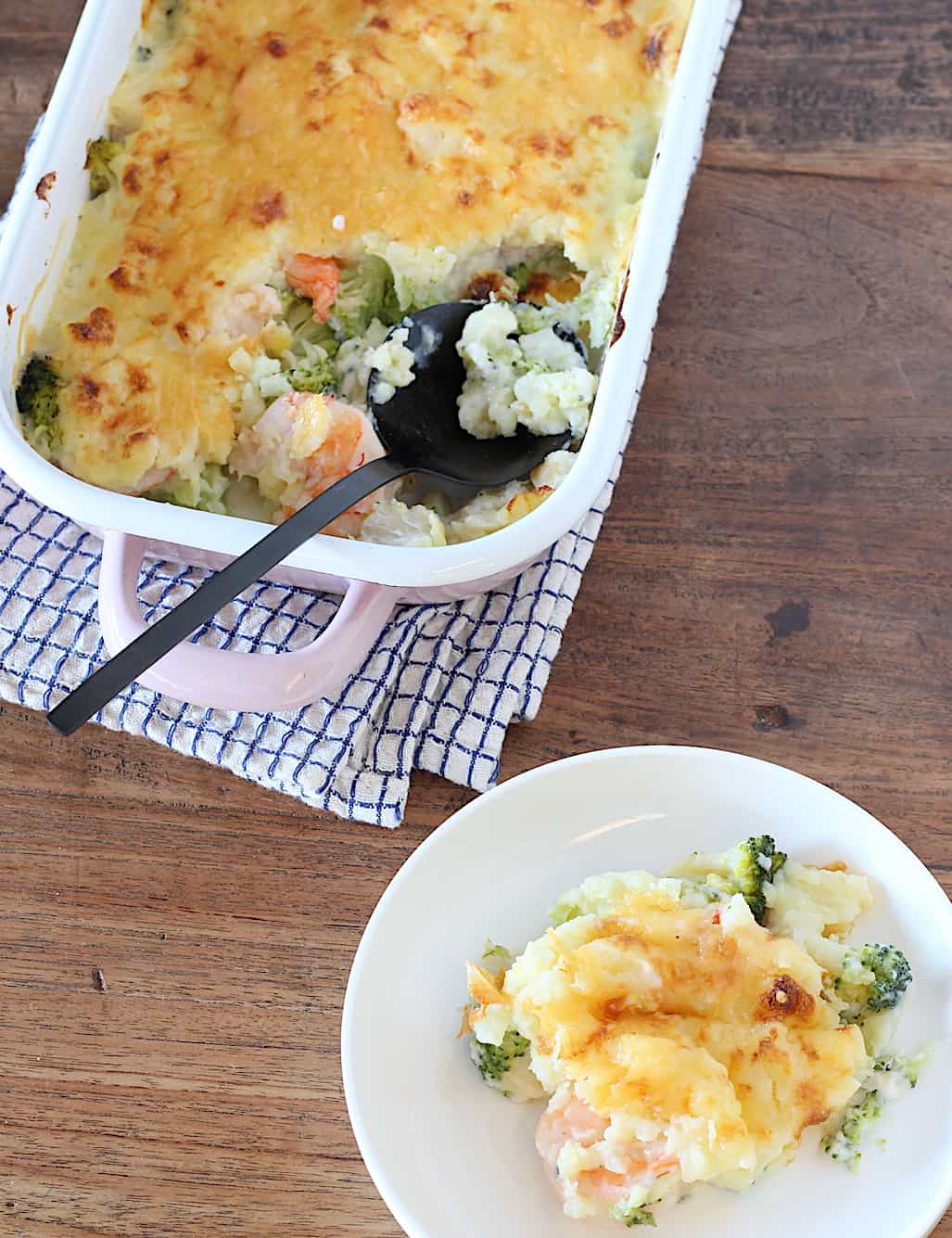 7. Schep de saus over de broccoli, garnalen en kabeljauw en meng. Verdeel daarover gelijkmatig de puree en eindig met een laag geraspte kaas.