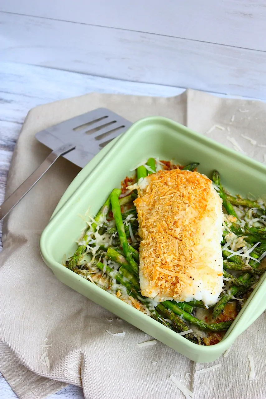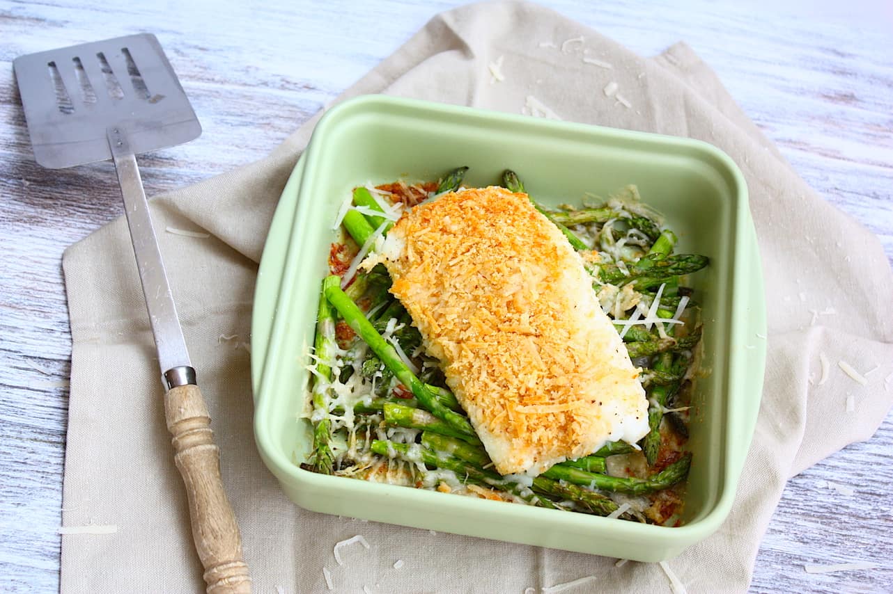 2. Maak in de tussentijd een mengsel van paneermeel, zout, peper en 2 el Parmezaanse kaas. Haal de schaal uit de oven en leg de kabeljauwfilets op de groene asperges. Verdeel het paneermengsel over de filets en zet de schaal voor 10 – 12 minuten terug in de oven.