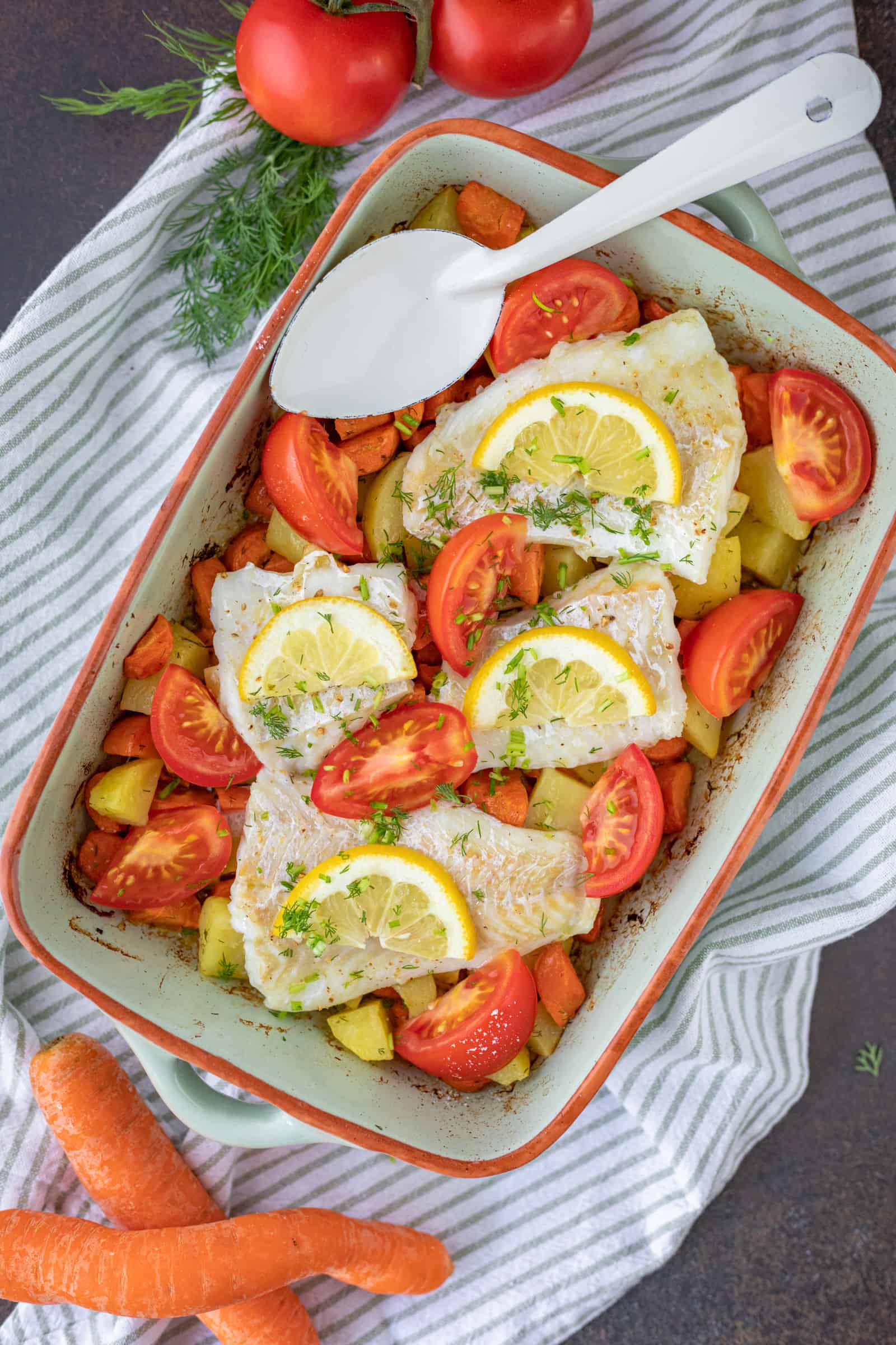 - Leg na 30 minuten (check eerst even met een vork of de aardappels en wortels net gegaard zijn) de kabeljauwfilets bovenop de aardappels en wortels. Leg op iedere filet een plakje citroen. Afhankelijk van de dikte hebben de filets circa 15 minuten nodig om te garen. Leg de partjes tomaat de laatste 5 minuten erbij.