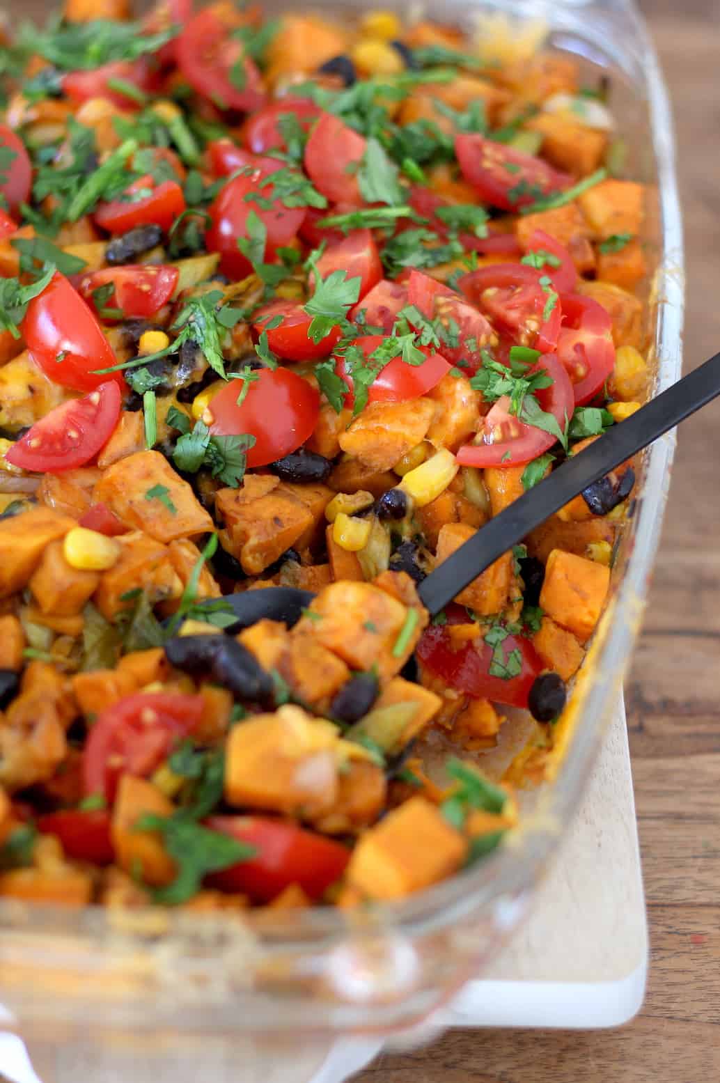 Zoete aardappel en bonen is voor mij een gouden combinatie. Voedzame ingrediënten, maar ook heel smakelijk en daarom koos ik ervoor om ze samen te voegen in een ovenschotel. Met wat maïs, lente-ui en cherrytomaten werd het een heerlijk gerecht waar iedereen thuis van heeft gesmuld!