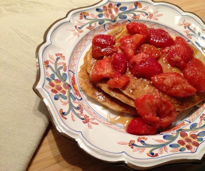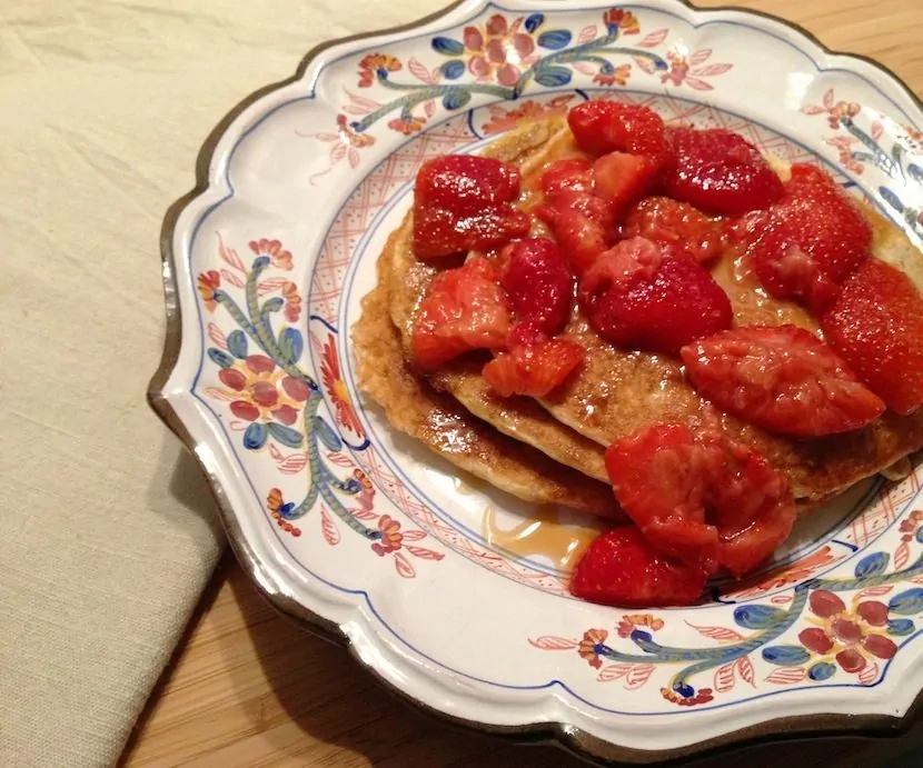 Serveer de pancakes met de gemarineerde aardbeien en zet ook het flesje ahornsiroop op tafel.