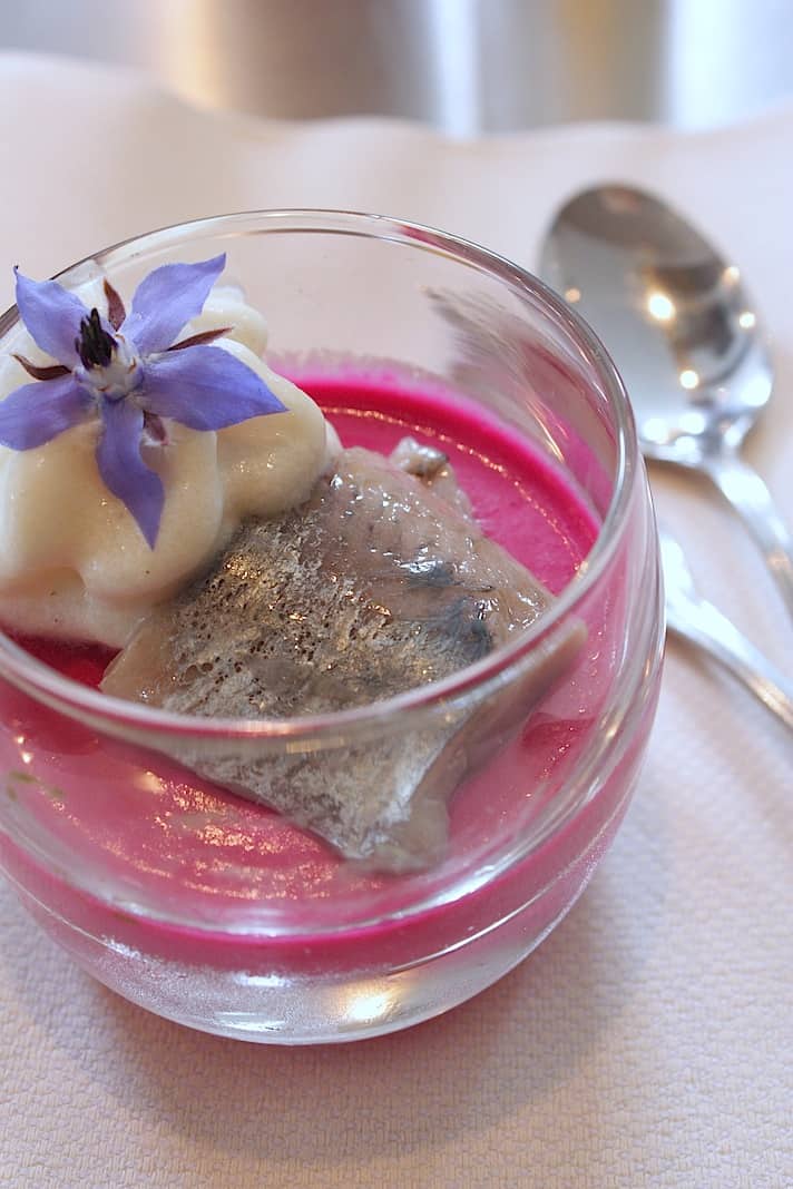 Tijdens mijn bezoek aan Friesland werd onze fijnproevers trip afgesloten met een kookworkshop bij restaurant De Jouster Toer in Joure. We gingen daar zelf aan de slag met ingredienten die we even daarvoor hadden geplukt in een natuurtuin. Chef kok Mark van Noord had echter alvast een gerechtje voorbereid als amuse. Een panna cotta van rode biet met haring en uienroom. Ik als panna cotta en haring liefhebster ging helemaal voor gaas hiervan. De romige panna cotta met de pure smaak van rode biet combineerde perfect met de volvette haring van dit seizoen. Ik kon niet wachten om dit recept met jullie te delen en na lief vragen wilde Mark mij het recept mailen! Deze keer dus niets van mezelf en heel van De Jouster Toer. Alhoewel, de foto is van mij en ik heb het recept iets aangepast zodat jullie het thuis ook makkelijk kunnen maken.