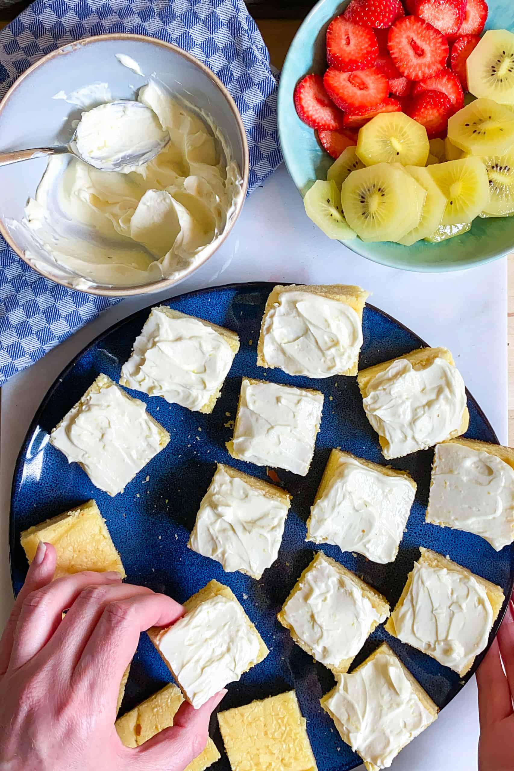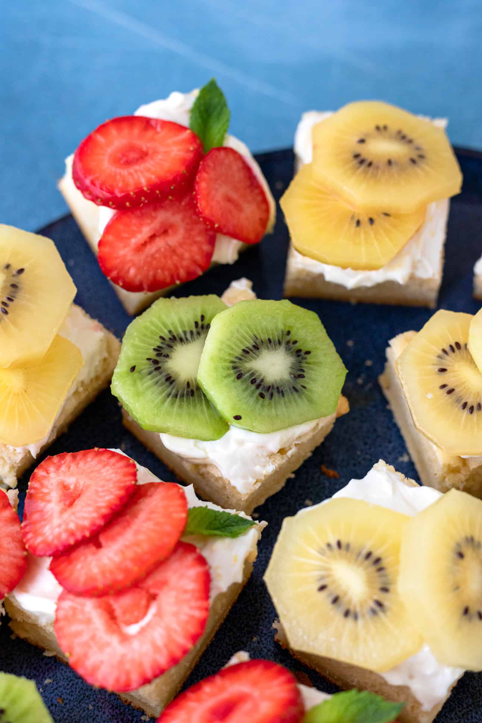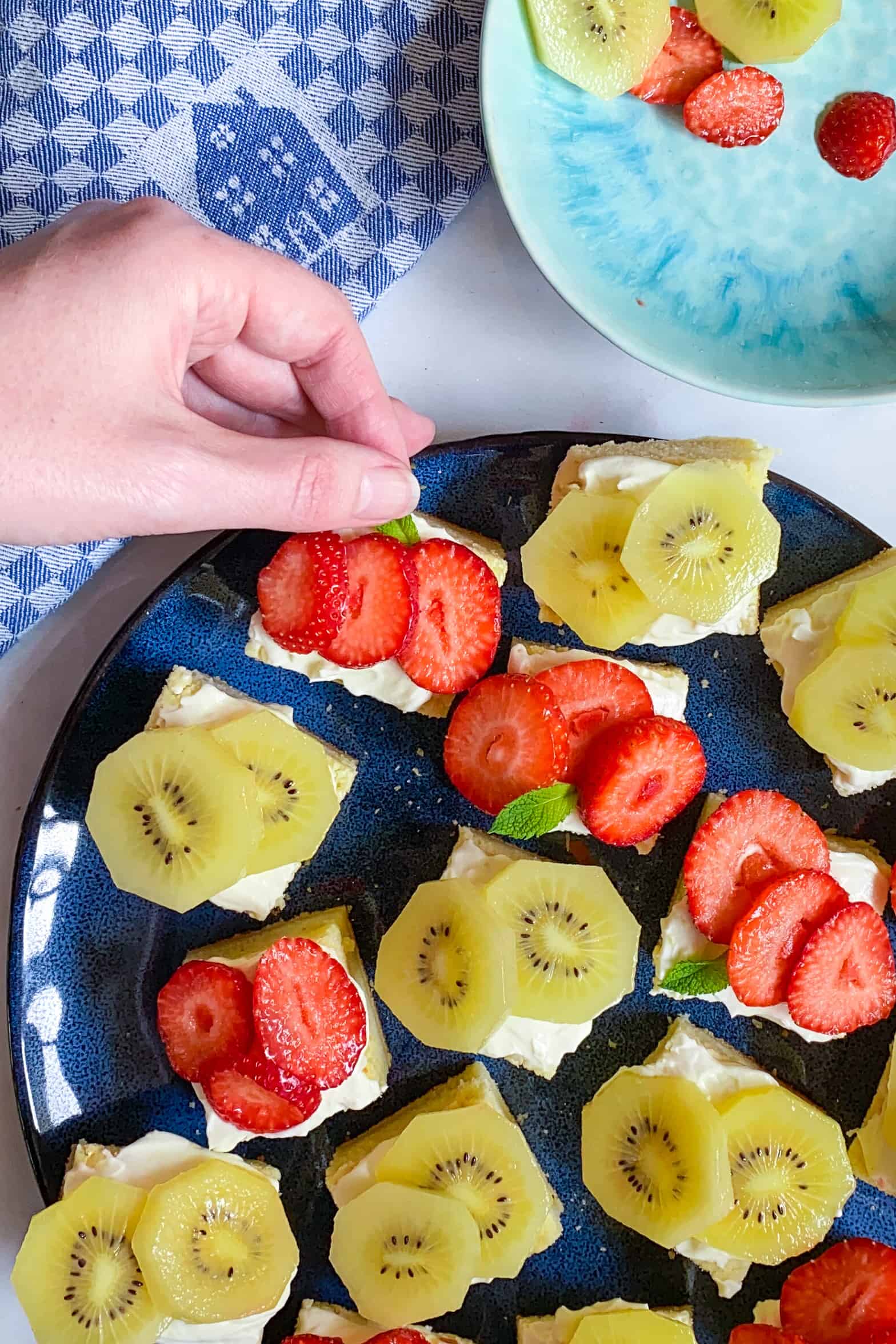 - Snijd de plaatpannenkoek in circa 16 stukjes en beleg ieder stukje met plakjes kiwi en aardbeien. Garneer eventueel met blaadjes munt. Serveer ze aan je kids (en aan jezelf) en geniet!