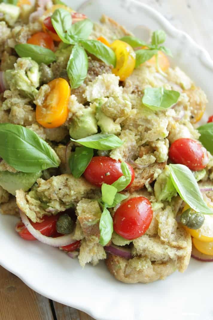In de Italiaanse keuken wordt er niets weggegooid, zo ook geen brood. Ze hebben daarvoor gewoon een aantal heerlijke gerechten bedacht. Oud brood wordt daardoor een held. Zoals bijvoorbeeld in deze pappa al pomodoro of je maakt er een panzanella van. Niets anders dan een broodsalade waarvoor je het oude brood laat weken in een marinade zodat het een tikkeltje zompig wordt. Met de nadruk op tikkeltje, want te zompig is ook weer niet lekker. Traditioneel wordt het brood vaak geweekt in water. Ik doe dat zelf niet, omdat ik het dan te vochtig vind. Maar weken met het vocht van de gebruikte tomaten, olijfolie en azijn daarentegen. Je weet niet wat je proeft zo lekker! Ik maakte al eens een variant op de panzanella, maar dan met gebakken brood en groene asperges (ook very nice) en vandaag staat er een meer traditionele panzanella op het menu. Deze keer met avocado, geïnspireerd door BBC Good Food.
