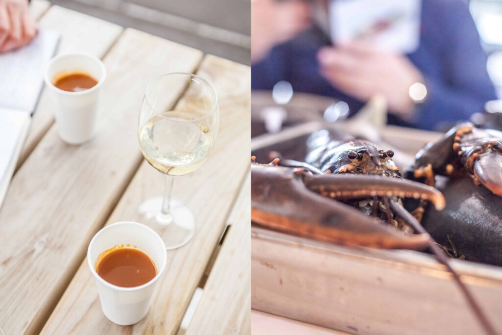 We eten fish and chips met aardappel, kabeljauw, augurk en gerookte eidooier (Hemingway), oester met duindoornbes, gekonfijte citroenschil, ponzu en gepofte Rijst (Spetters) en Oosterschelde Kreeft met Granny Smith, geitenkaas en Romanesco (’t Vlasbloemeken).