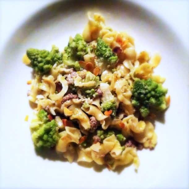 Een mooi en voedzaam pastagerecht, geïnspireerd door de ingredienten van de Krat. Waar mijn kleine jongen ook heel lekker van heeft gegeten. Ik gebruik voor dit gerecht een romanesco, ook wel torentjes bloemkool genoemd. Een heel gezonde groente die tussen een bloemkool en broccoli in zit. Als je deze niet kunt vinden, is voor dit gerecht gewone bloemkool ook een prima alternatief.