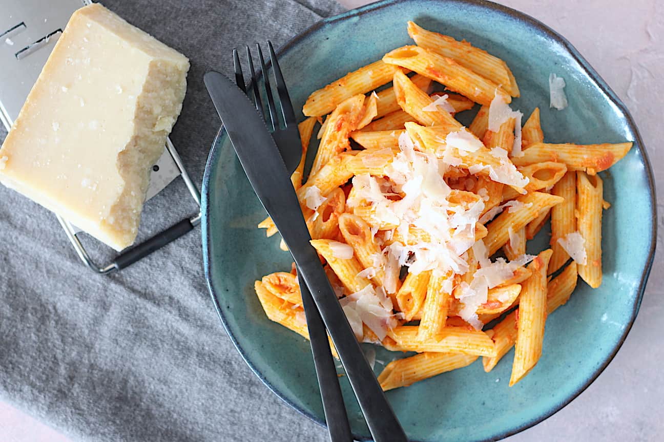 - Serveer de penne alla gin met een ruime hoeveelheid geraspte Parmezaanse kaas en eventueel nog een snufje zwarte peper.