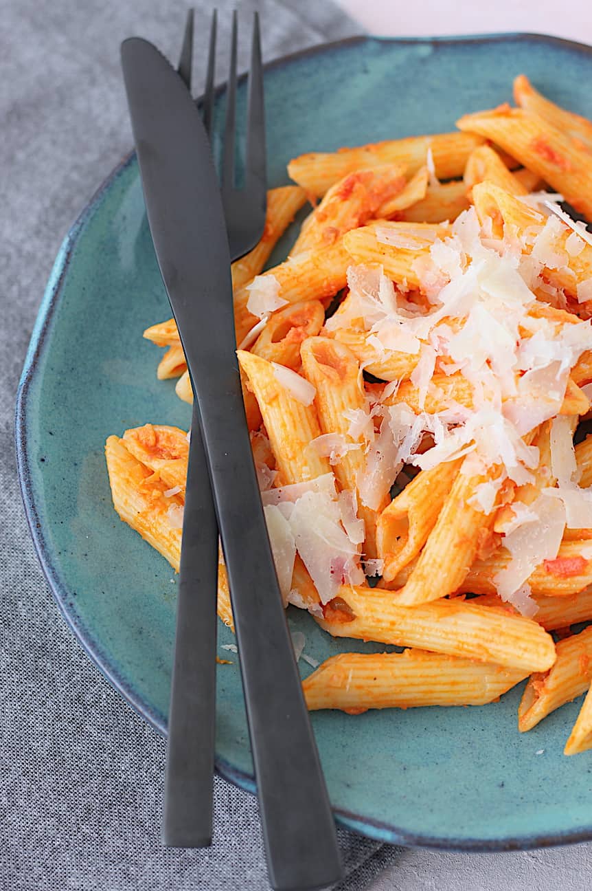 - Serveer de penne alla gin met een ruime hoeveelheid geraspte Parmezaanse kaas en eventueel nog een snufje zwarte peper.