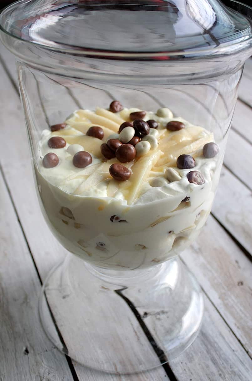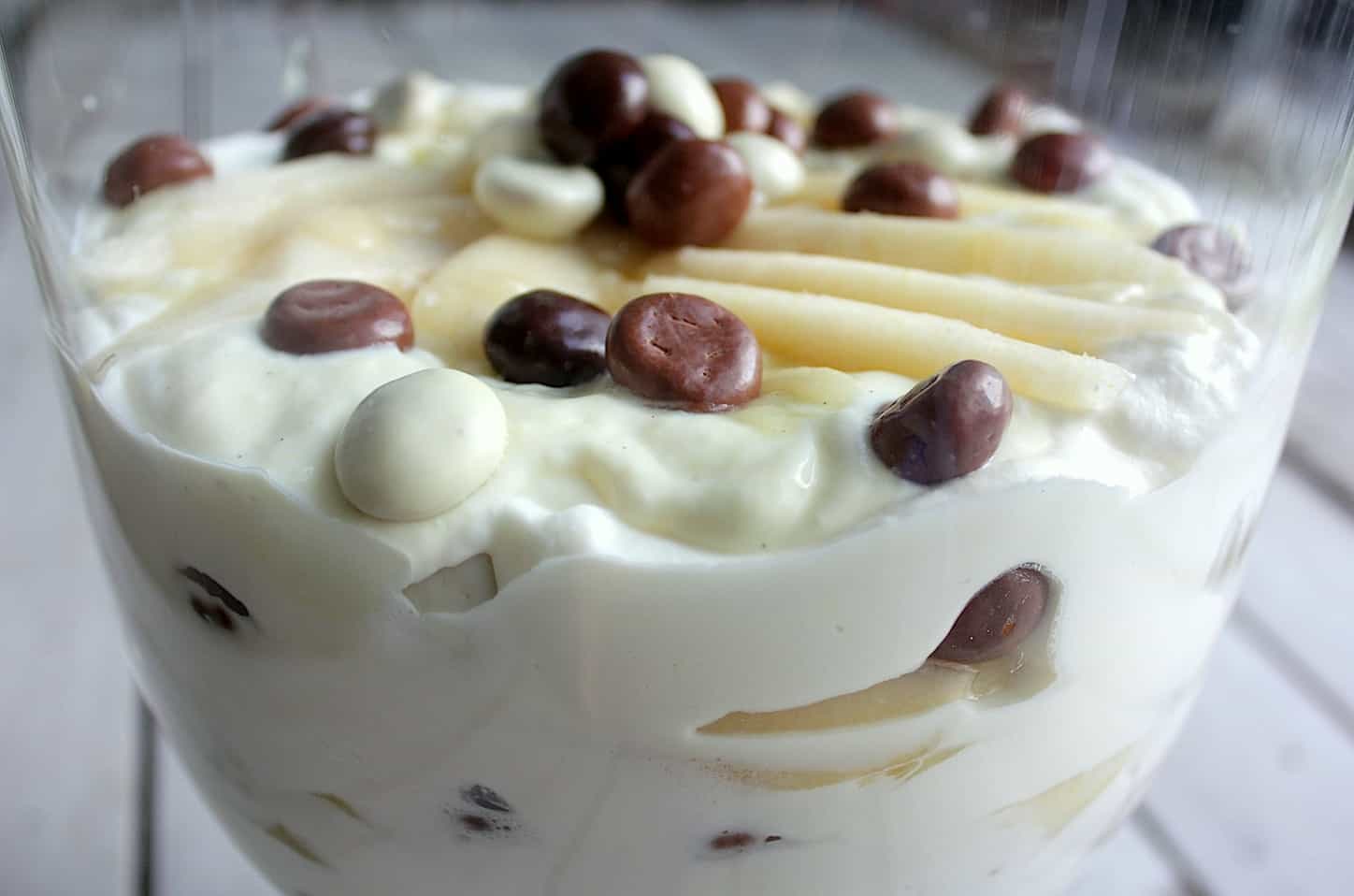Dan is het tijd voor het ‘bouwen’ van de trifle! Pak een grote (glazen) schaal of bak. Verdeel de cantuccinikoekjes over de bodem en maak daarna een laag die je opbouwt met vanillevla, slagroom, peer, karamel en chocolade kruidnoten. Herhaal dit nog 2 of 3 keer. Eindig met een laag peer waarbij je de partjes in een mooie waaier legt (hier heb je ongeveer 1,5 peer voor nodig). Druppel hier nog wat karamel over en bestrooi met kruidnoten. Serveer direct of zet nog even koel tot gebruik. Je kunt deze trifle tot een uur of 4 van tevoren al opbouwen. De vla en de boterkaramel kun je de dag ervoor al bereiden.
