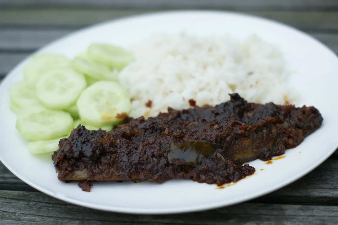 Deze makreel is behoorlijk pittig en dus heerlijk met komkommer om een beetje verkoeling te bieden. Wij thuis eten zelfs alle boemboe met de rijst op, maar je kunt het er ook af halen, de vis neemt al genoeg van de lekkere smaken op. Selamat makan, oftewel eet smakelijk! Â
