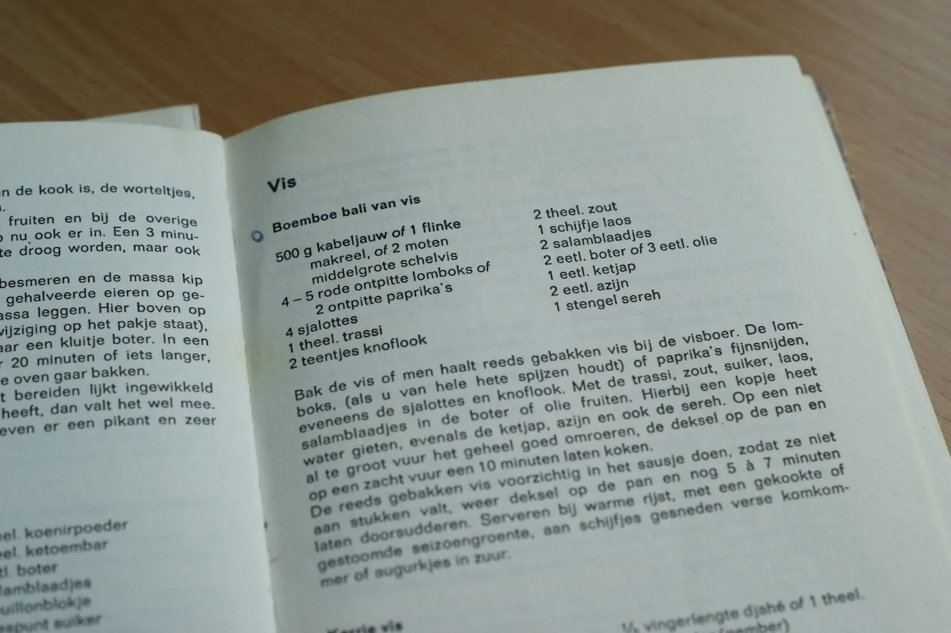 Ik heb een geweldig Indische kookboekje waarin alle denkbare recepten staan opgenomen. Dit boekje van Lia Warrani is zo oud dat alle blaadjes loslaten en het uit elkaar valt als je iets wil opzoeken. Toch vind ik het zo’n fijn boekje dat mijn moeder en ik regelmatig discussiëren over de voogdij ervan. Mam, sorry, het is verjaard en dus nu van mij.
