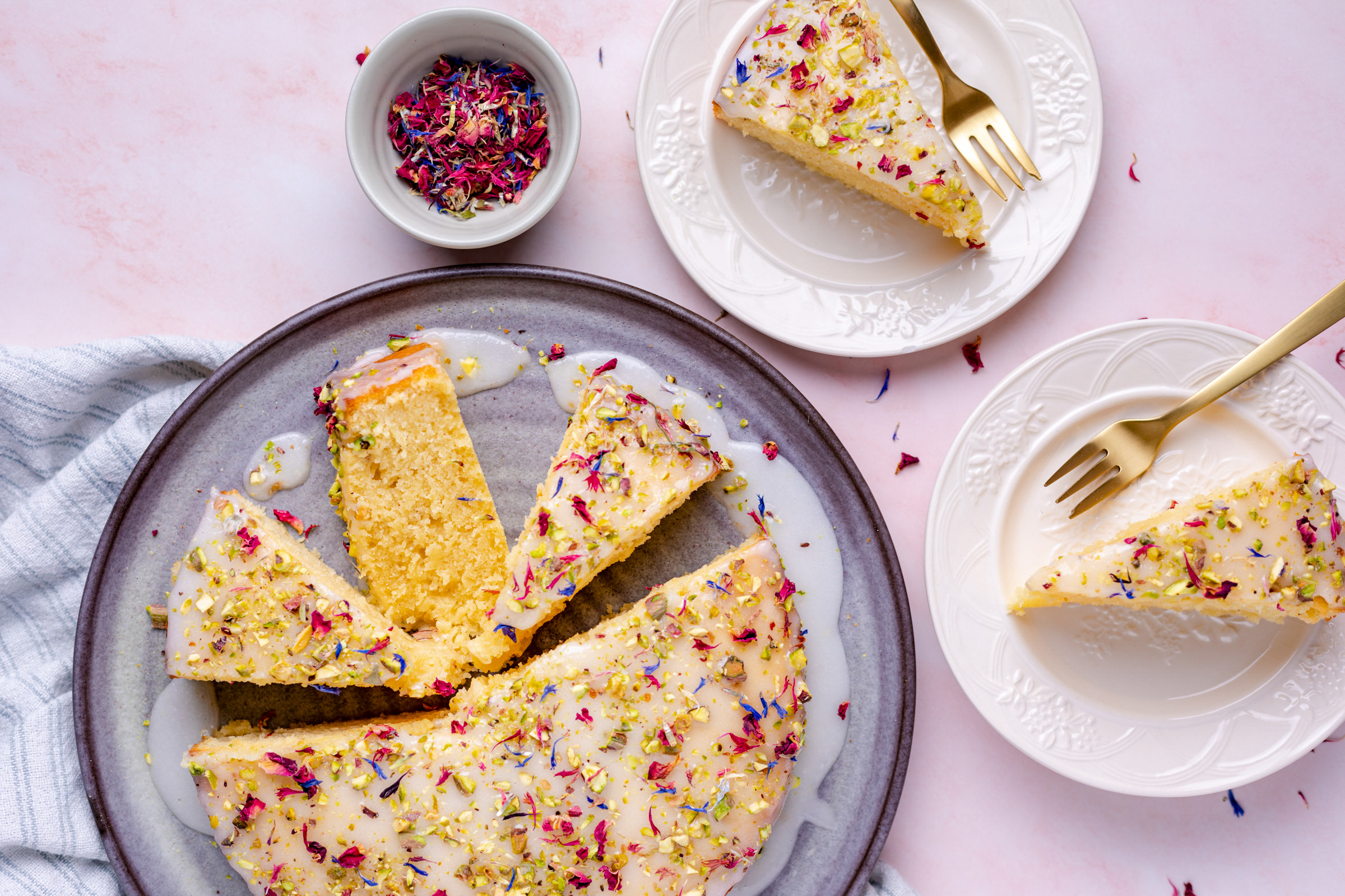 - Als de cake volledig is afgekoeld, draai je ‘m weer om en plaats je ‘m op een mooi bord of een taartschaal. Verdeel het glazuur over de bovenkant en strijk glad met het paletmes of de bolle kant van een lepel. Garneer de Perzische liefdescake met de fijngehakte pistachenoten en eetbare rozenblaadjes.