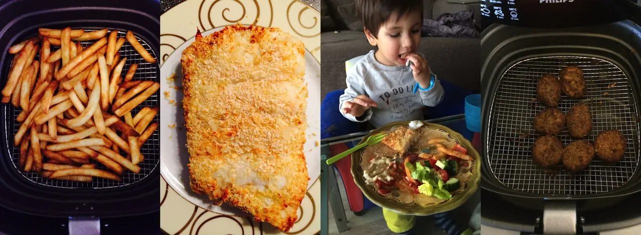 Ik begon natuurlijk met het bakken van frietjes. Na het doorspitten van de gebruiksaanwijzing kwam ik erachter dat je helemaal geen vet hoeft te gebruiken bij het bakken van diepvriespatat. Ietwat sceptisch stopte ik de frietjes in de Airfryer en ik vroeg me af hoe er dan goudbruine en knapperige frietjes uit zouden komen. Groot was mijn verbazing, want de friet die eruit komt is superlekker! Mooi gekleurd en knapperig, precies zoals het hoort. Maar dan zonder vet. De belangrijkste persoon in ons huishouden heeft ze ook goedgekeurd. Precies, de peuter.