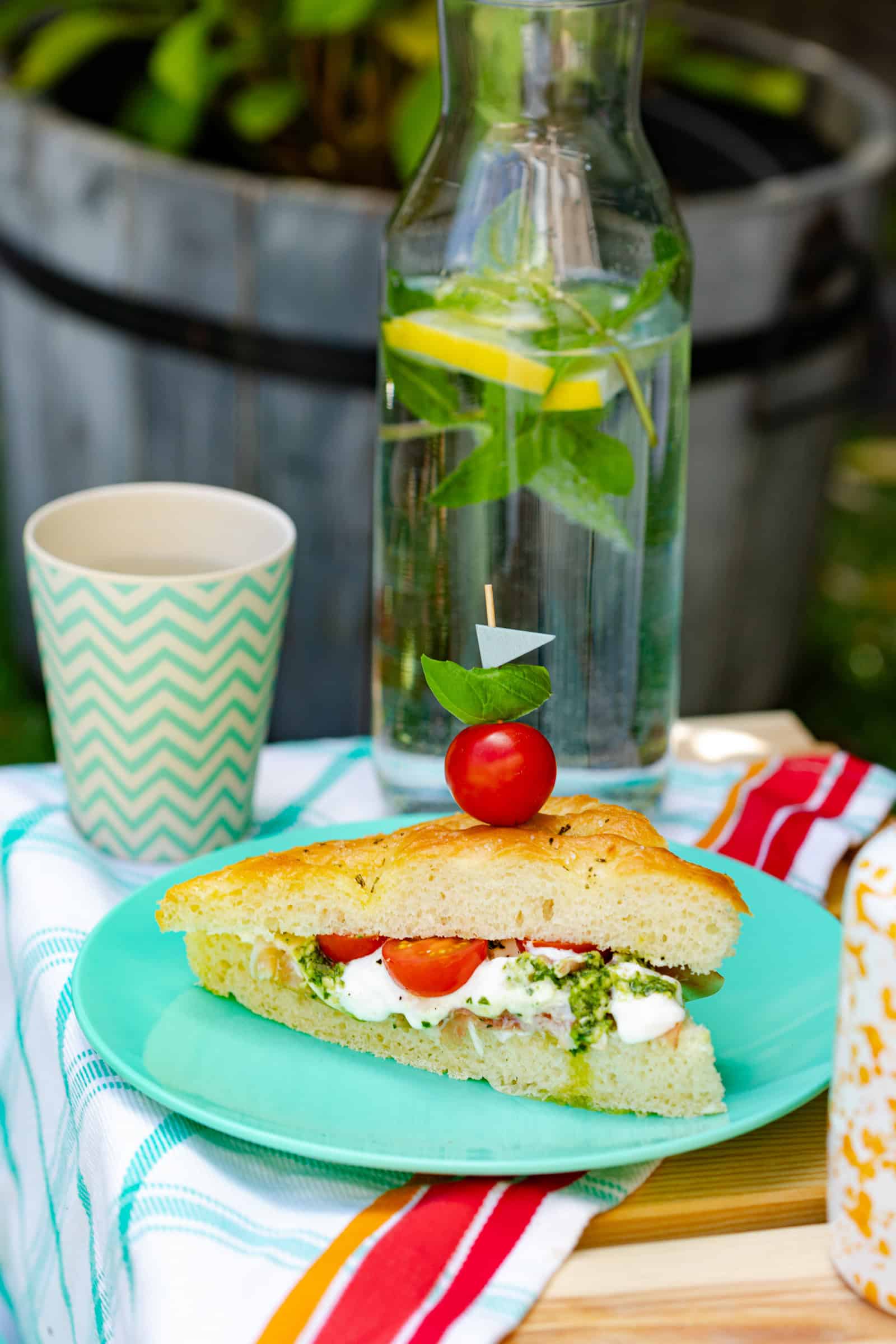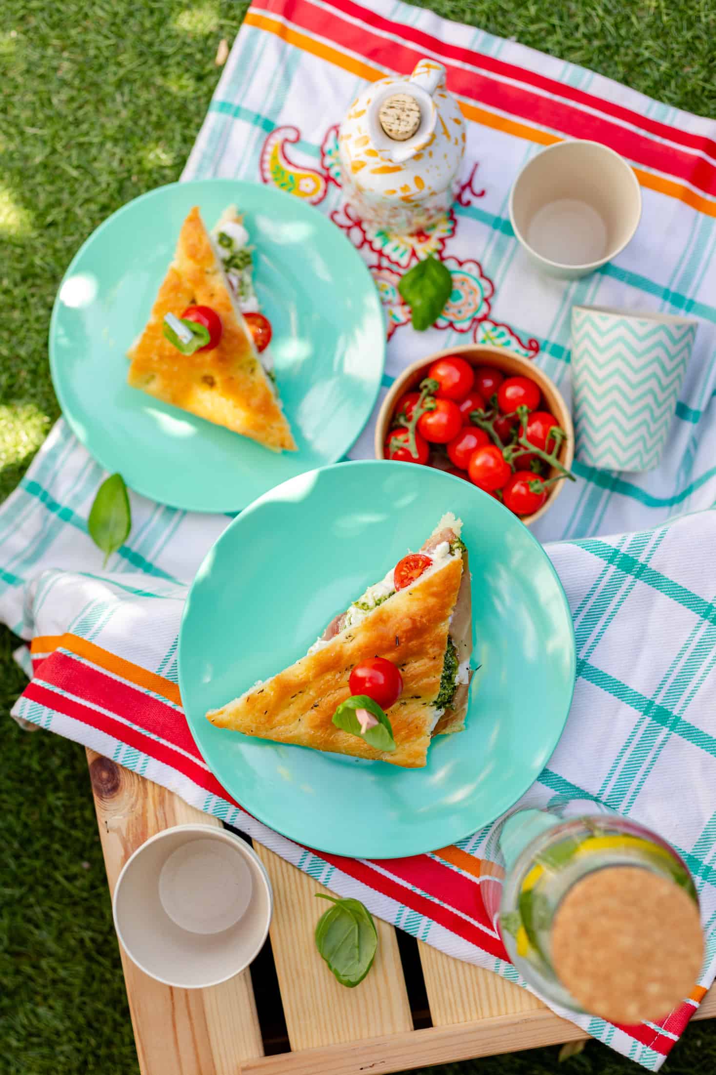- Dek de picknick sandwiches af met de kapjes van de focaccia en snijd ze schuin doormidden, als een triangel.