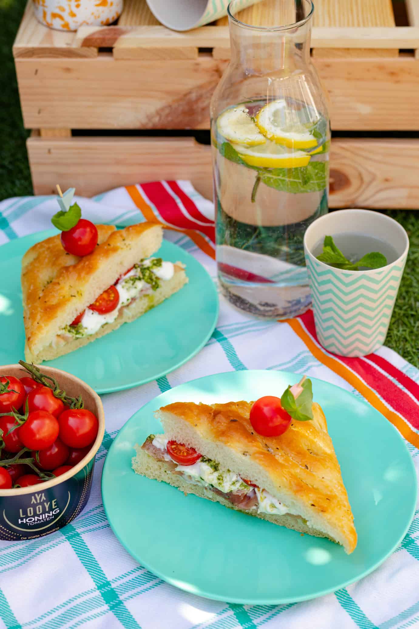Samenwerking – Buiten eten is voor mij een van de fijnste dingen in de lente- en zomermaanden. Zodra het kan, staat bij ons de achterdeur wagenwijd open en leven we in de buitenkeuken. Maar ook een wandeling op het strand of ergens op een grasveldje turen over het water terwijl de zon bijna onder gaat vind ik een feest. Natuurlijk hoort daar ook een kleine picknick bij, want er past altijd wel iets te eten in de strand- of rugtas! Vandaag deel ik met jullie een van mijn favoriete recepten voor dit soort momenten: een picknick sandwich met mozzarella, Looye Honingtomaten, pesto en prosciutto.