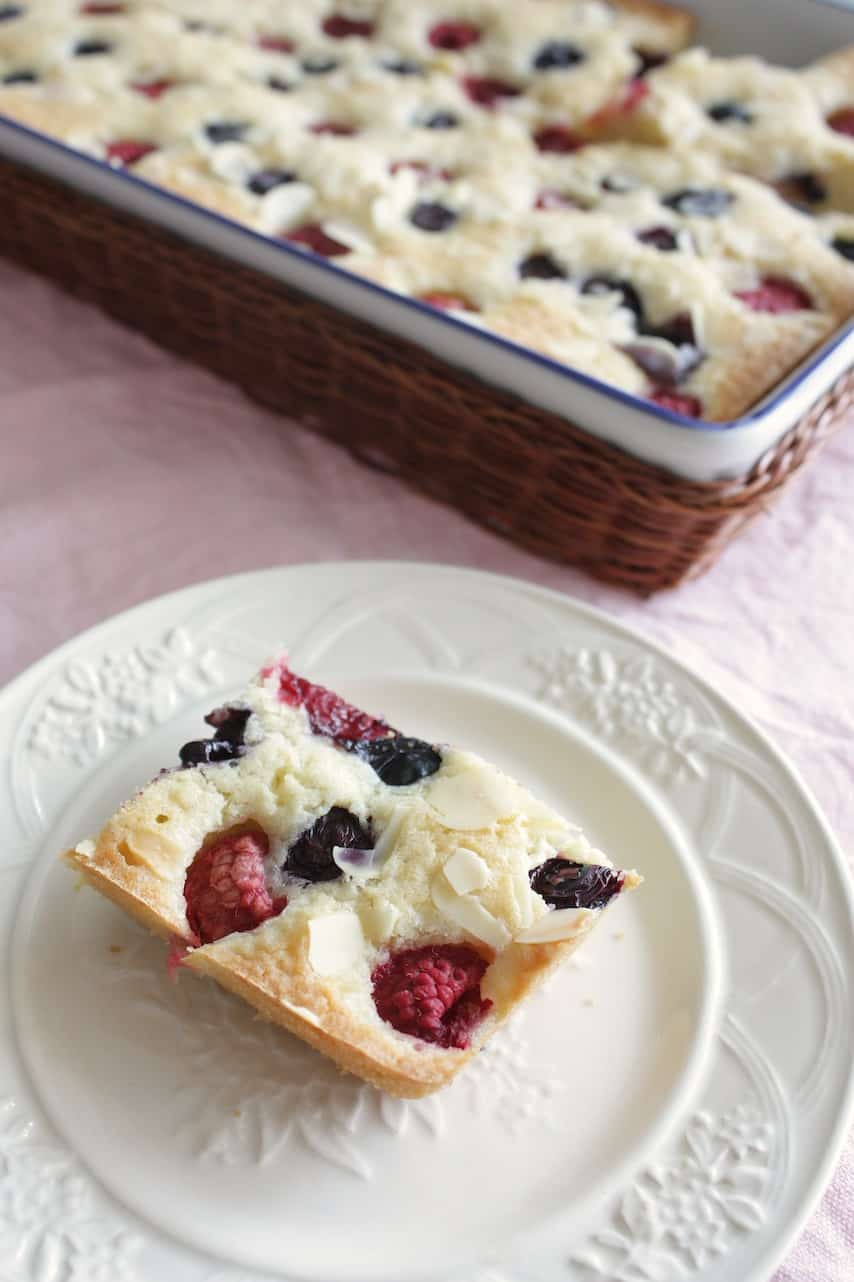 Ik heb deze plaatcake al meerdere keren gemaakt, maar iedere keer waren de foto’s te erg om te publiceren. Dat krijg je als je ‘s avonds om 23 uur aan het bakken bent en het enige normale licht wat nog voorhanden is, de 2 peertjes van de afzuigkap zijn. Maar deze plaatcake met bosbessen en frambozen is zo goed dat ik ‘m echt nog een keer overnieuw wilde maken voor jullie. Het originele recept is van Rudolph en stond in de Delicious. Ik heb er nog wat citroen en frambozen aan toegevoegd en ach, maak ‘m en je zult het proeven 🙂