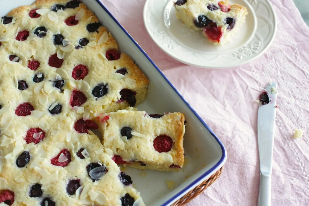 Klop de boter los met de suiker en vanillesuiker totdat je een licht, romig mengsel hebt. Voeg de eieren, yoghurt en citroenrasp toe en klop nog even door. Spatel de bloem erdoor totdat je beslag net gemengd is. Schep het beslag in je ovenschaal, strijk glad en verdeel de bosbessen frambozen erover. Druk deze iets in het beslag. Strooi als laatste de amandelschaafsel erover en schuif de ovenschaal in de oven.