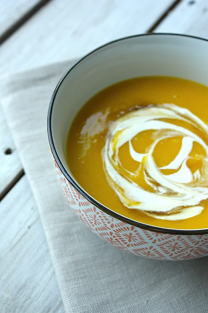 Serveer de pompoensoep met een flinke dot crème fraîche en druppel nog wat truffeljus of -olie in de soep.