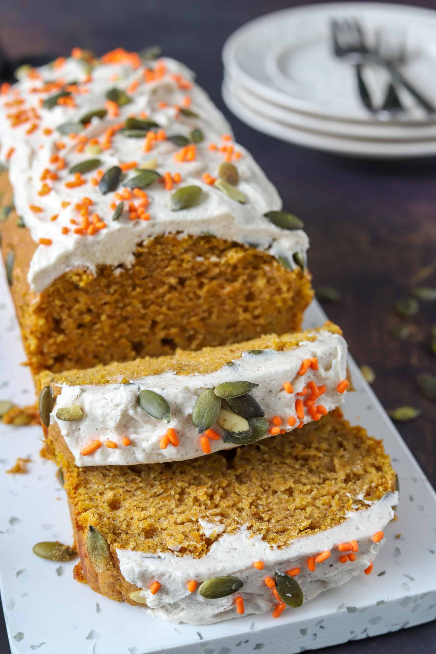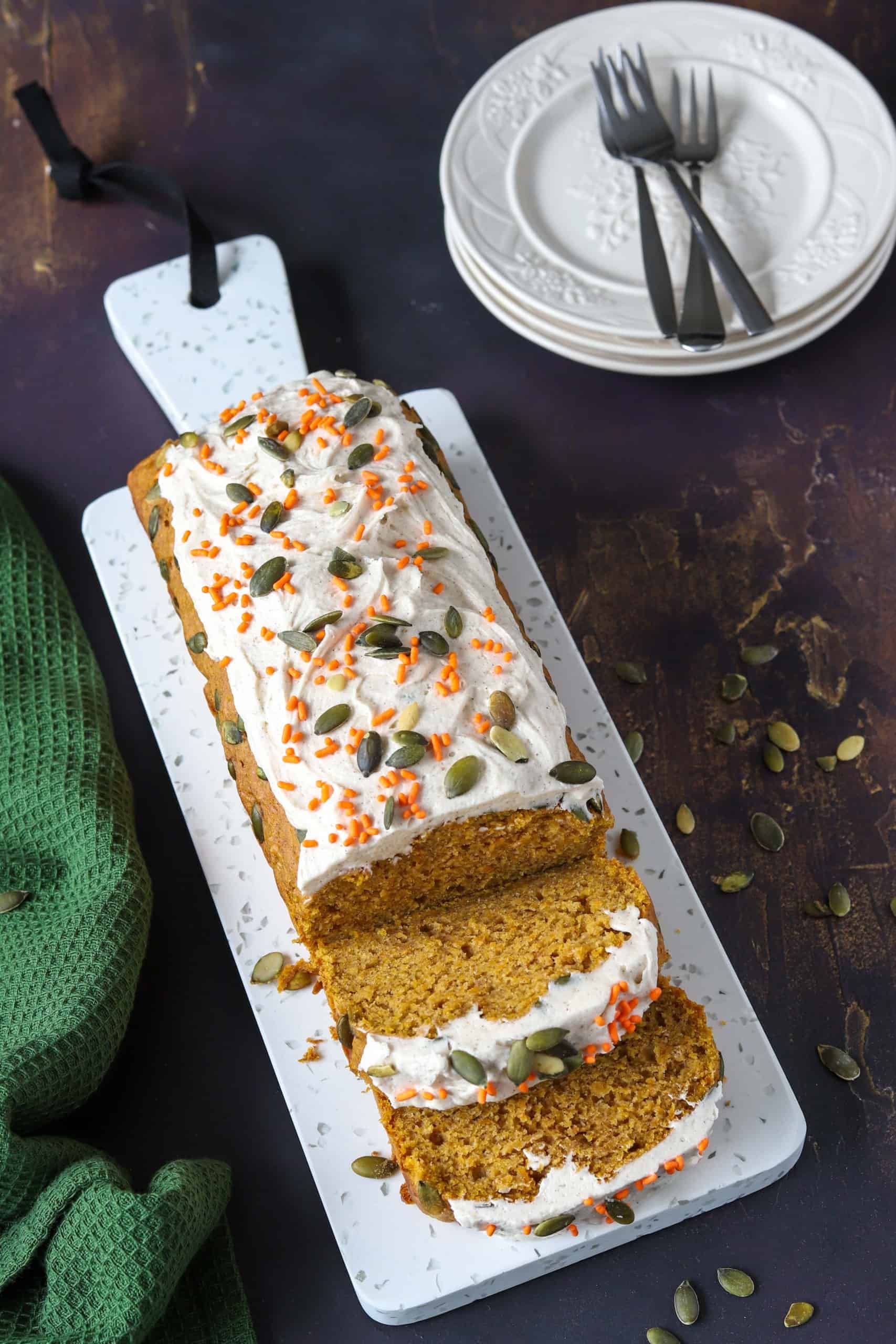 - De pumpkin spice frosting smaakt heerlijk bij deze cake, maar is geen must. Zonder smaakt deze pompoencake namelijk ook geweldig. Mijn kinderen kunnen dat beamen, want die willen nooit frosting op hun zoete baksels en hebben 'm dus zonder gegeten.