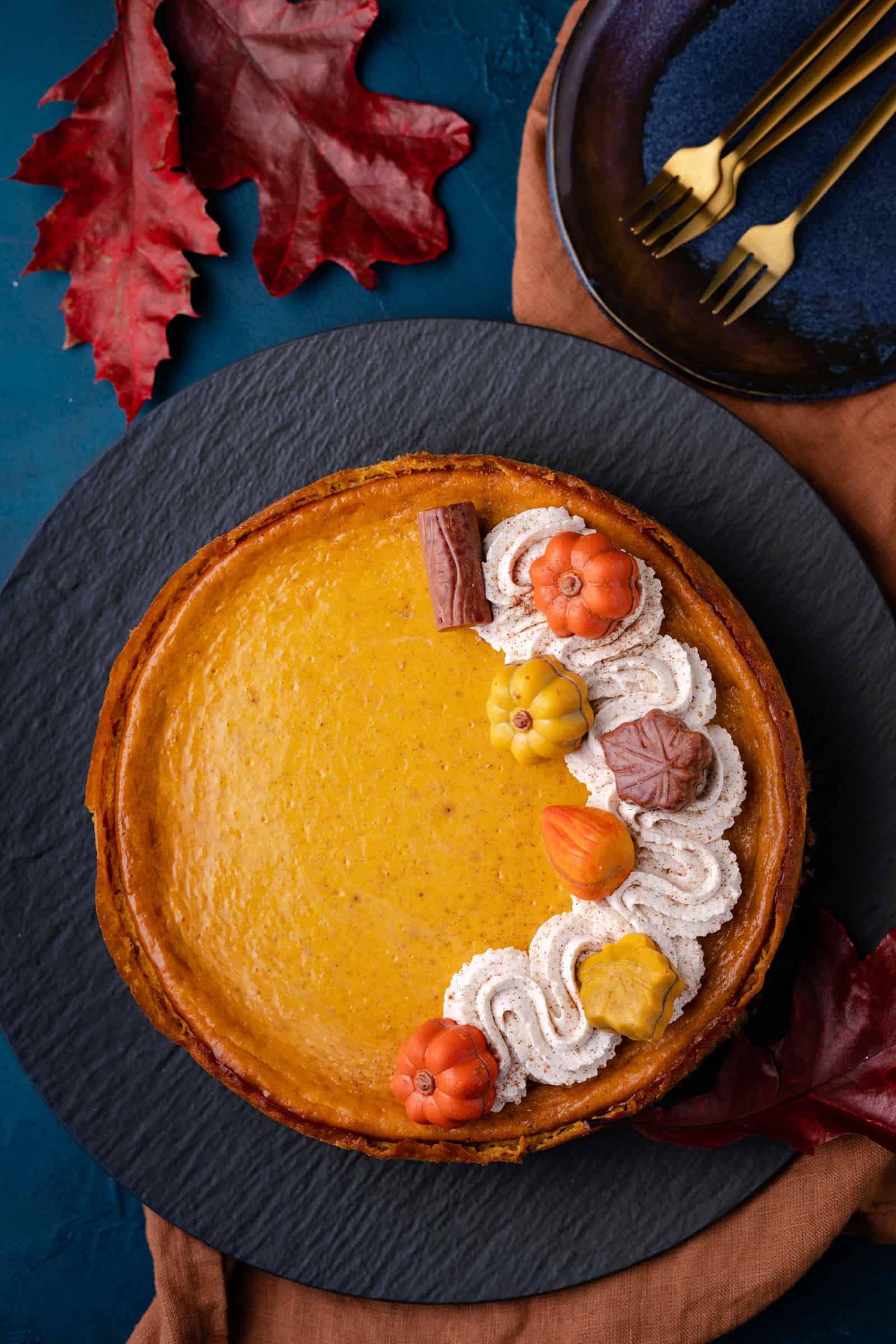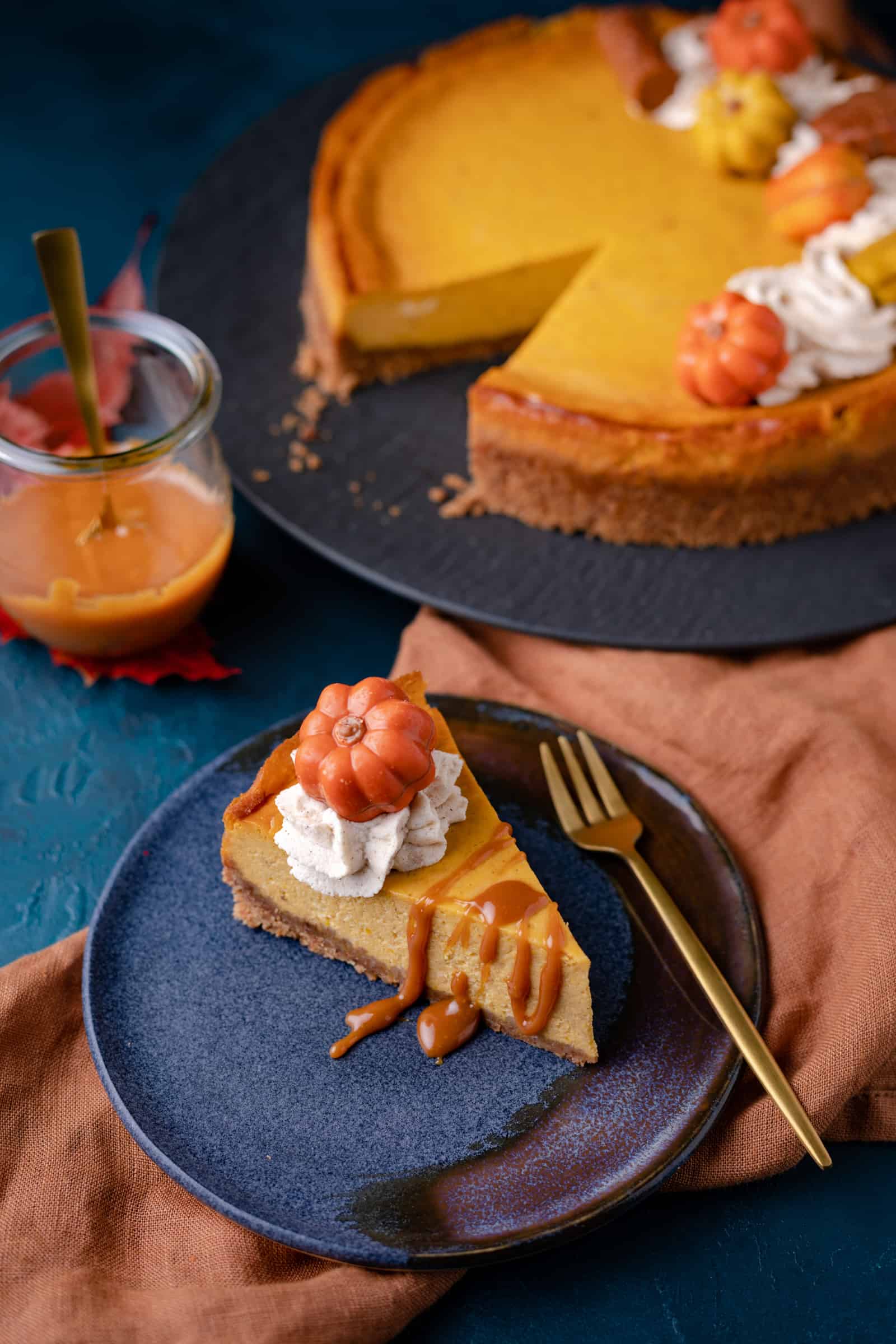 Ik garneerde de pompoencheesecake met kaneelslagroom en herfstige chocolade die ik bij de groenteboer (of all places!) vond. Maar als je deze chocolaatjes niet kunt vinden, dan kun je ‘m ook garneren met chocolade hulstblaadjes, feestelijke sprinkles, kleine takjes rozemarijn of iets wat je zelf mooi vindt. Last but not least serveerde ik er ook nog sinaasappelkaramel bij. Nou, als dat geen feestelijke cheesecake meer is, dan weet ik het niet meer ;-). Geniet ervan!