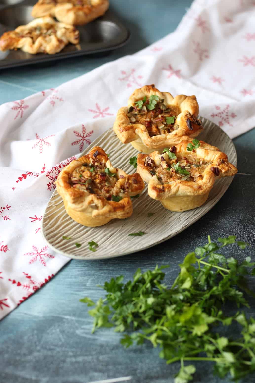 5. Verdeel de vulling gelijkmatig over de vormpjes en druk het overhangende bladerdeeg een beetje rommelig in model zodat je een mooi randje krijgt. Kwast het bladerdeeg in met losgeklopt ei en bestrooi met de gehakte pecannoten en pompoenpitten.