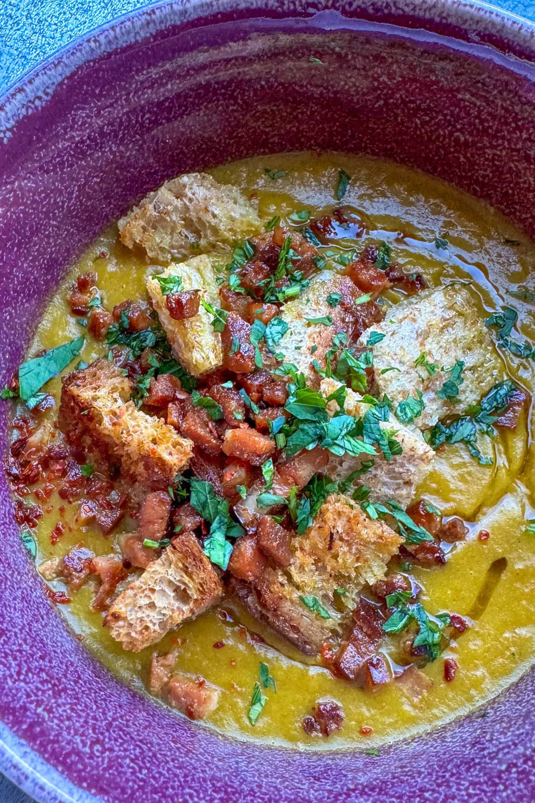 - Verdeel de soep over 4 kommen. Garneer met knoflookcroutons, krokante spekjes, wat pul biber of zwarte peper, druppeltjes olijfolie en fijngehakte peterselie.