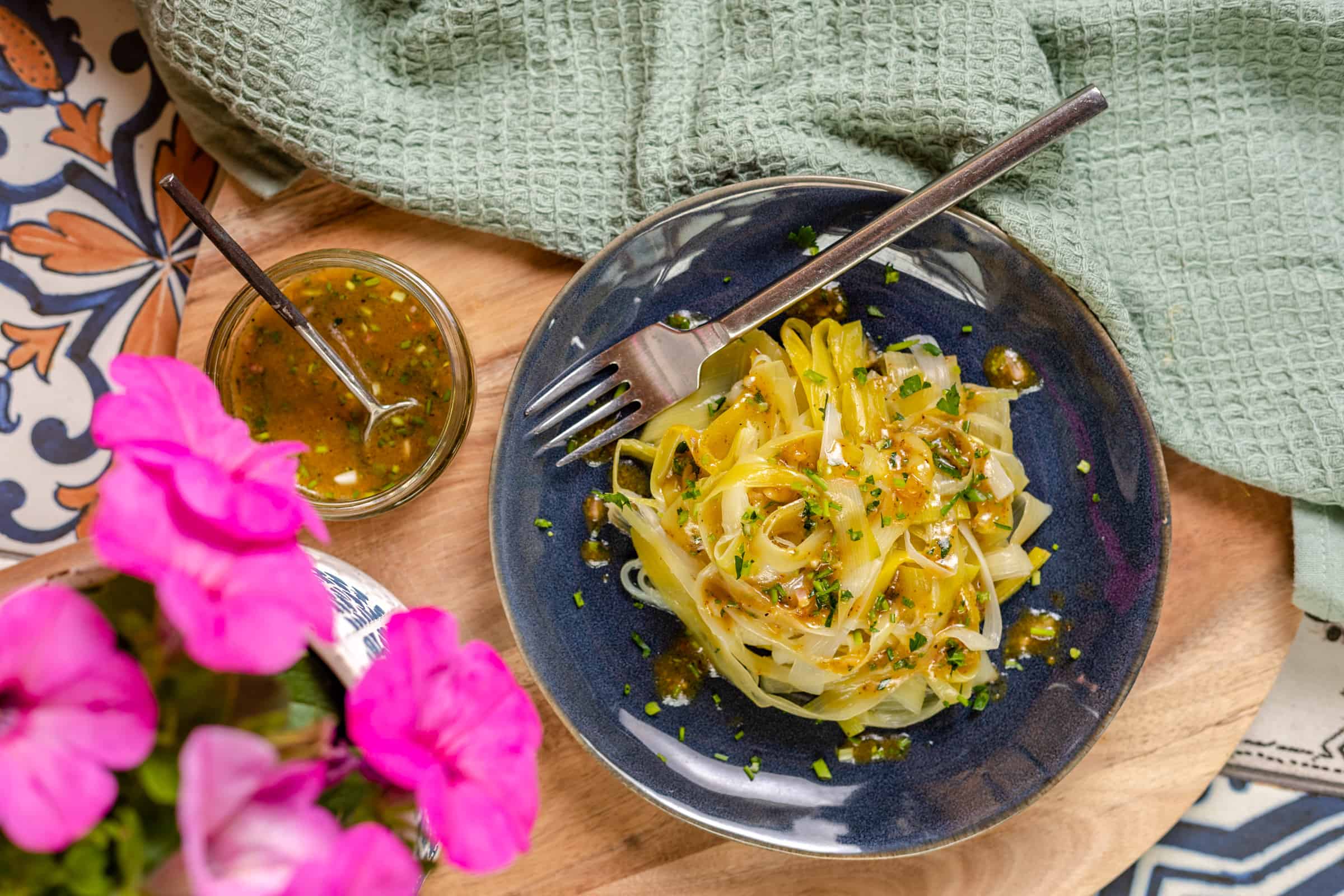 Als de prei van de barbecue komt, snijd je de stengels in de lengte open en kun je de gare prei zo uit de buitenste (zwarte geblakerde) schil halen met een vork of tang. Die buitenste schil gooi je weg en van de gare prei kun je een heerlijke preisalade maken met een kruiden vinaigrette. Zalig als bijgerecht bij de barbecue of om te combineren met andere geroosterde groenten. Het recept vind je hieronder!