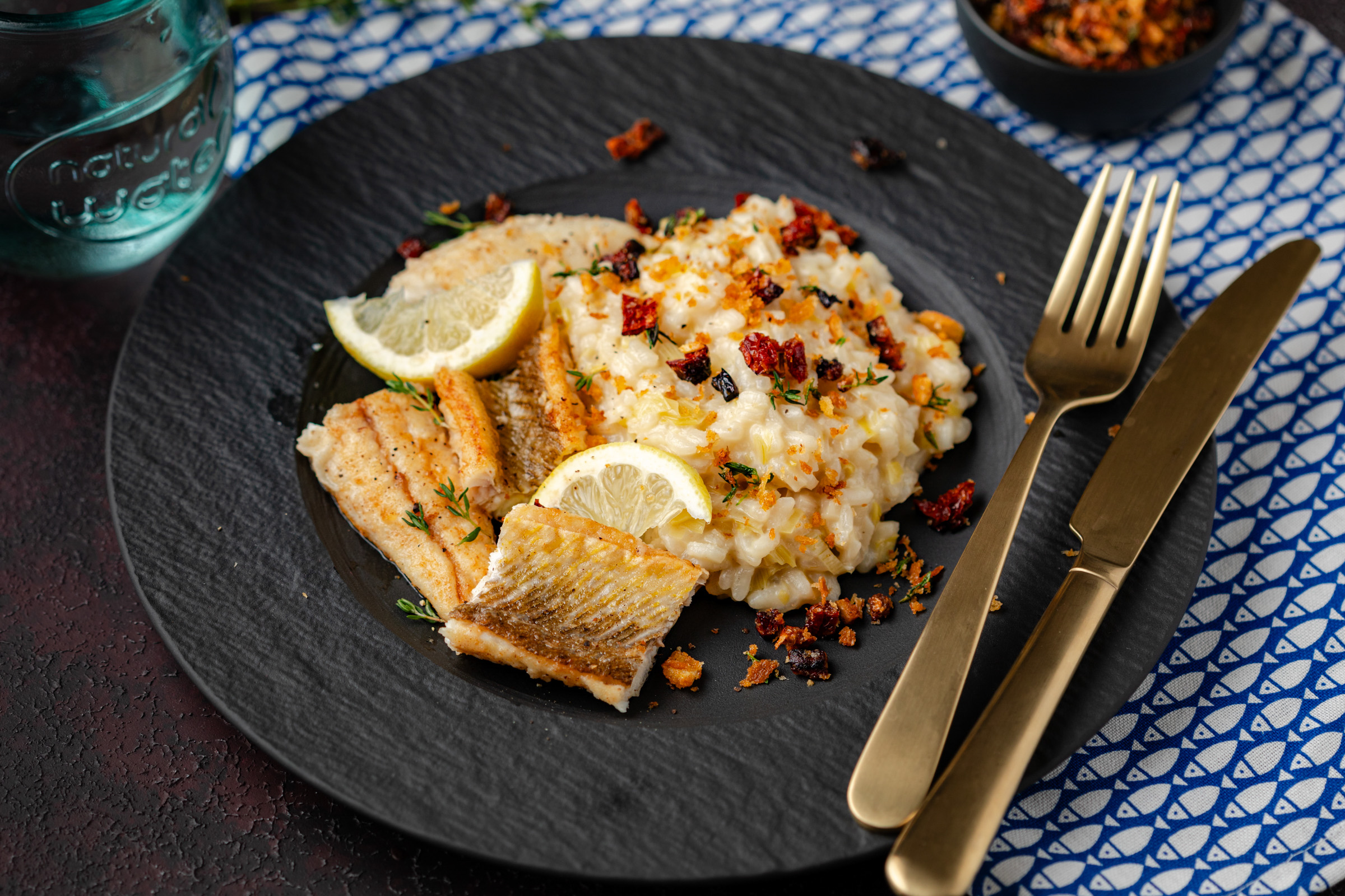 Preirisotto met gebakken pietermanfilet en tomaatkruim