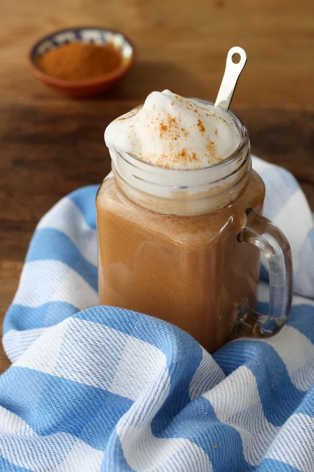 3. Klop wat amandelmelk op. Schenk je pumpkin chai latte in een grote mok, schep er wat opgeklopte amandelmelk op en garneer met een snufje pumpkin spice specerijen. Gelijk opdrinken, maar dat gaat vast wel lukken.