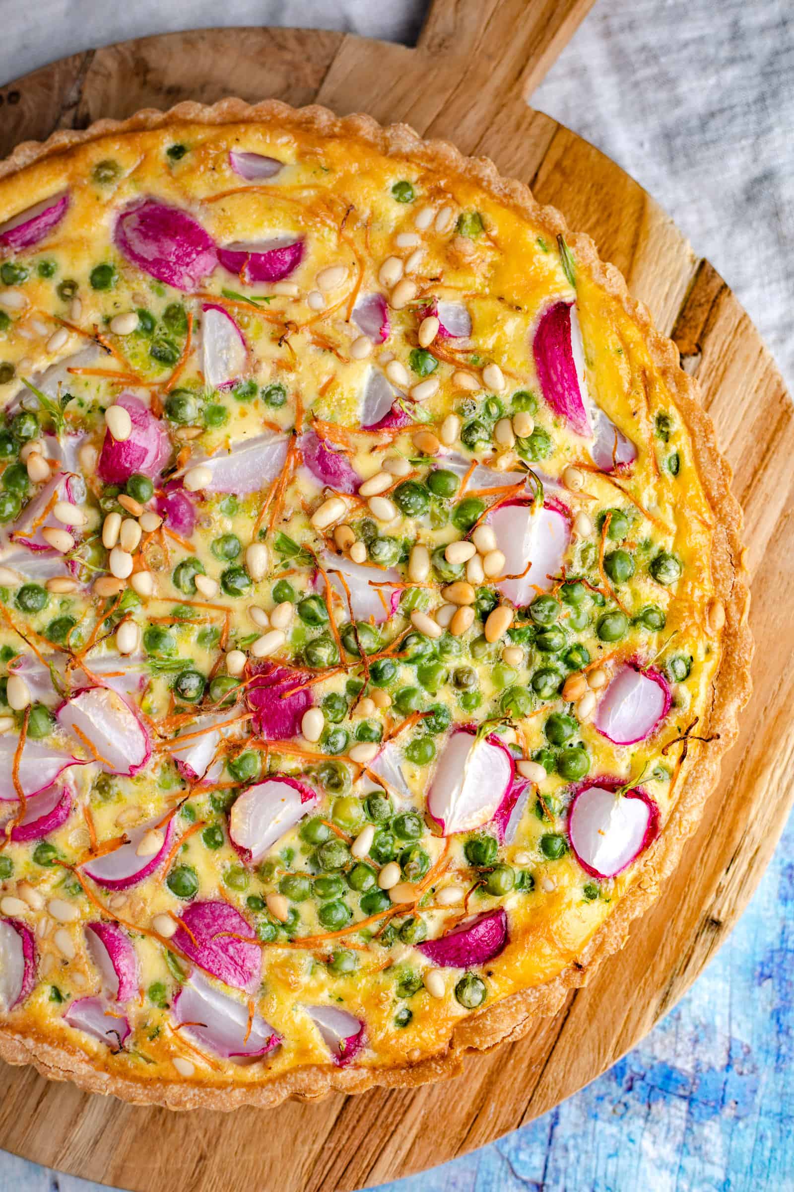- Verdeel de radijsjes en doperwten over de bodem en verdeel daar naar smaak wat pesto over, zo’n 3 tot 4 eetlepels. Klop de slagroom los met de eieren, 25 gr Pecorino en een snuf zout en peper. Schenk dit over de vulling heen en strooi als laatste nog wat pijnboompitten erover.