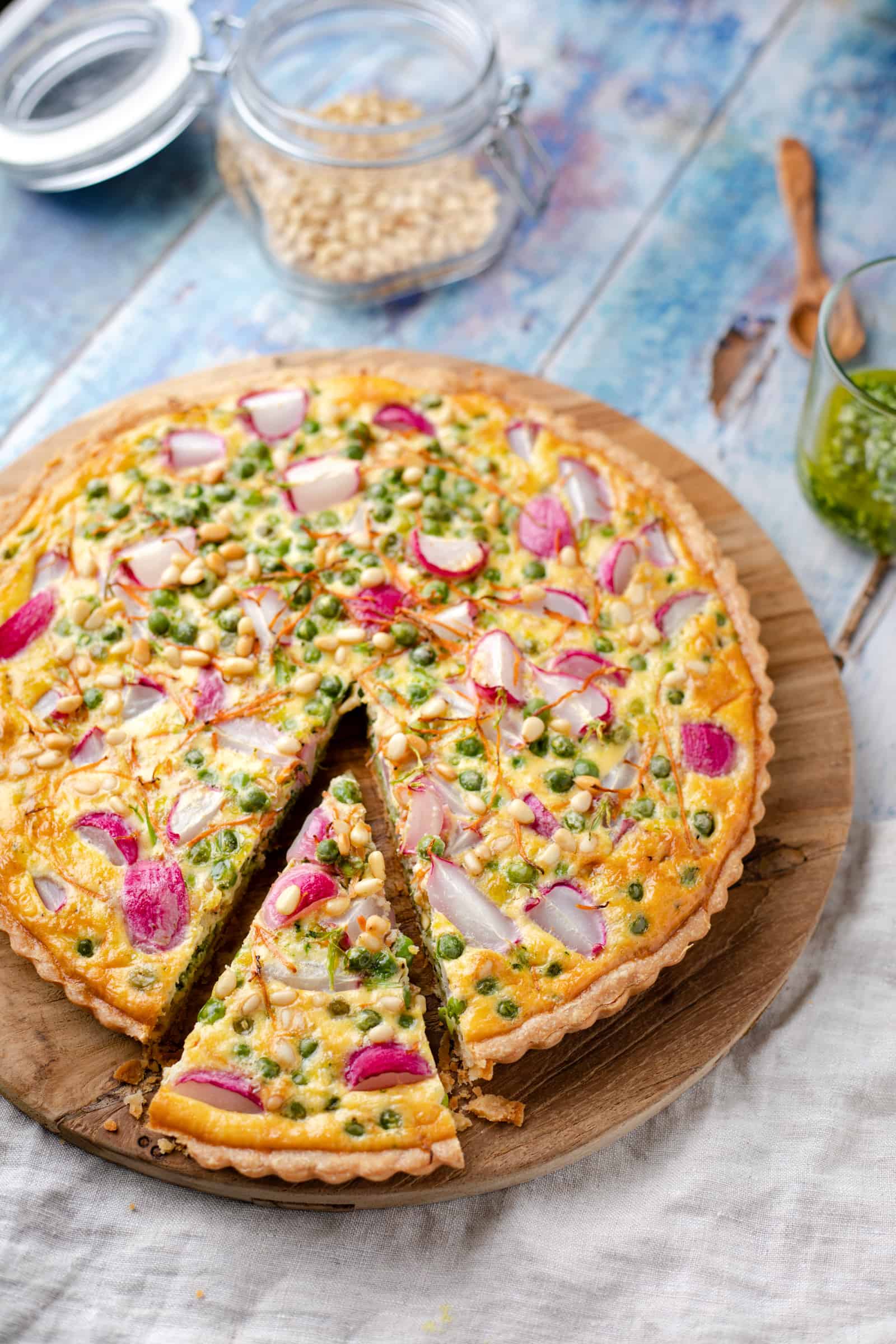 - Snijd het deeg rondom bij met een scherp mesje (of vouw overlappend deeg over de vulling heen) en zet de quiche in de oven voor 40 - 45 minuten. Als de quiche goed gaar en goudbruin is, kan deze uit de oven. Laat iets afkoelen op een rek en snijd daarna in punten. Serveer de quiche met radijsjes en doperwten met de overgebleven pesto.