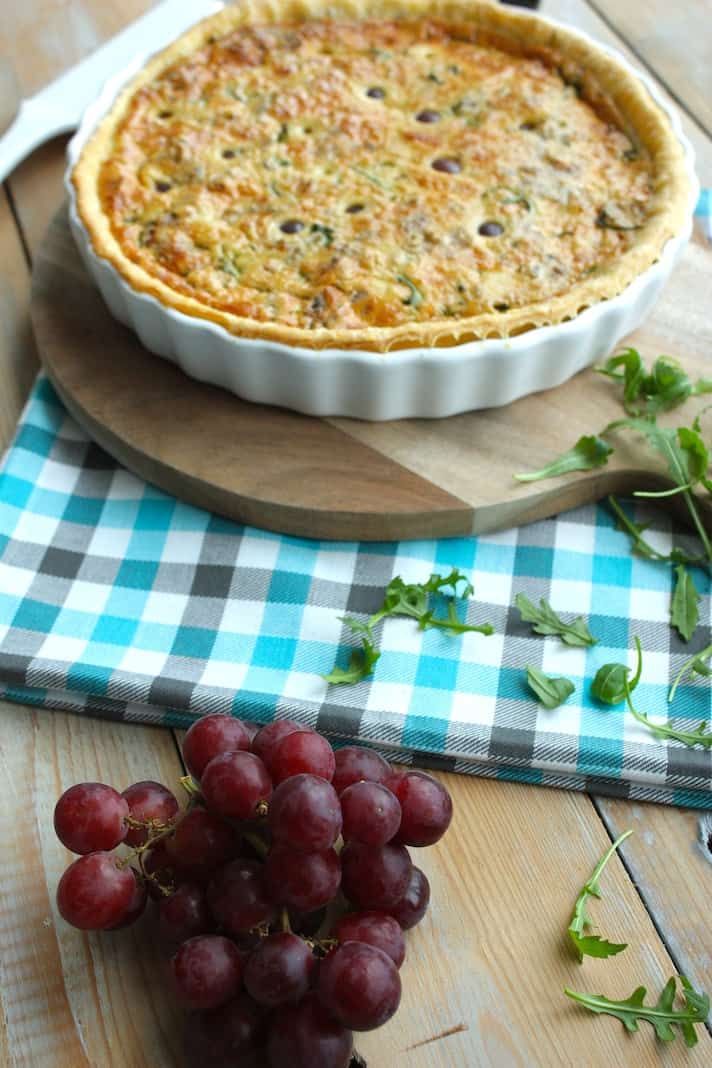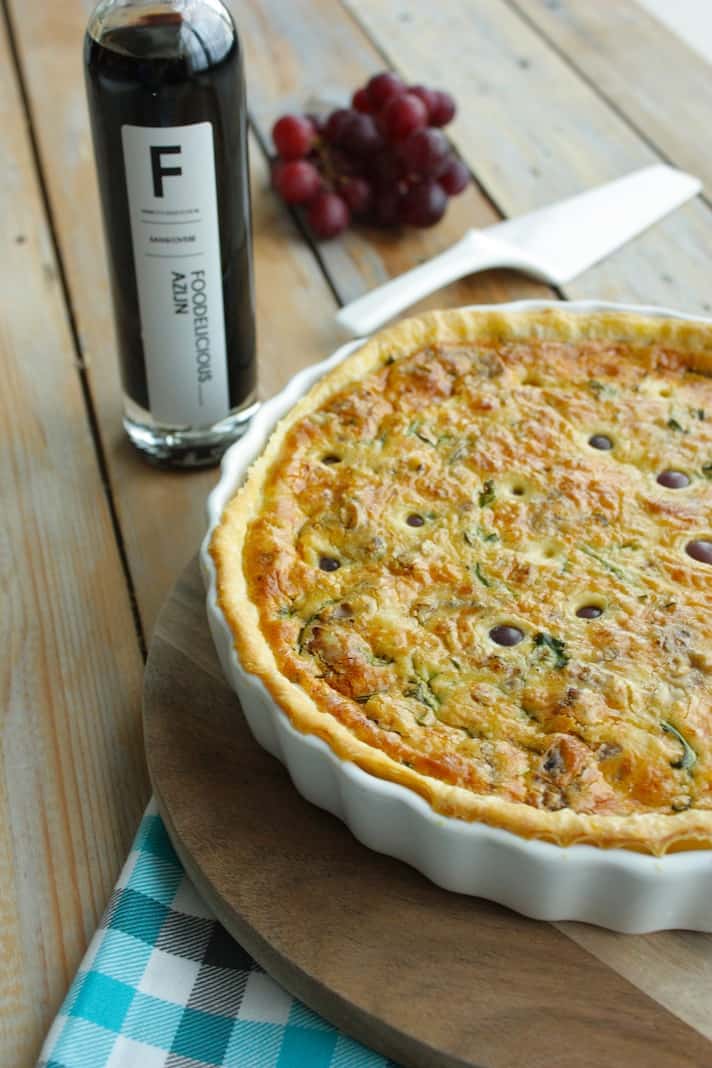 Dit is een geweldige azijn in combinatie met kaas of voor een saladedressing. Maar bijna iedere azijn is goed te combineren met salade en daarom wilde ik eens een ander gerecht maken. Ik combineerde de ingredienten van een salade (rucola, oude kaas, walnoten en druiven) met elkaar en maakte daar een quiche van met een licht zoete nasmaak door de druiven en de Sangiovese azijn. Mijn voorproevers waren dolenthousiast voer deze quiche en vonden het echt een aanrader. Zelfs de peuter at het achter elkaar op inclusief de groene rucola die hij eigenlijk niet eet in zijn ‘ik eet geen groen’ fase.