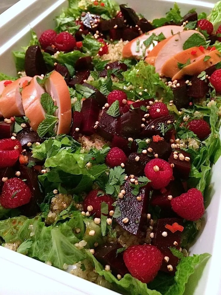 Neem een grote saladeschaal en verdeel daar de sla in. Breek deze grof met je handen en strooi daar de gekookte quinoa over. Snijd de bieten in stukjes, verwijder de zaadlijst van de rode peper en snijd in hele fijne stukjes. Strooi deze samen met de frambozen en stukjes rode biet over de salade. De kipfilet snijd je in dunne plakjes en deze geef je ook een plek in de salade.