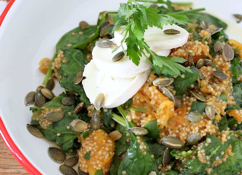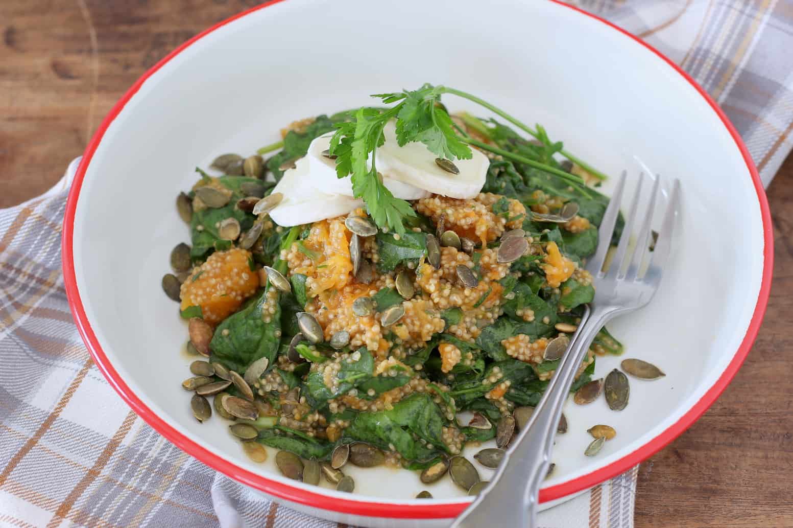 - Meng de quinoa in een schaal met peterselie, spinazie en de geroosterde pompoen. Proef en breng naar wens verder op smaak met citroensap, olijfolie extra vergine, peper en zout.