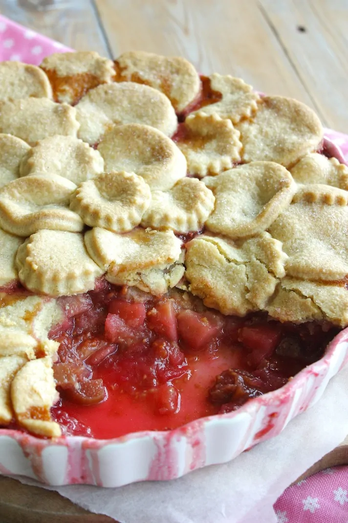 Verwarm de oven voor op 180 graden en haal je plak deeg uit de koelkast. Pak een grote ronde ovenschaal (een quicheschaal werkt bijvoorbeeld goed) en schep hier het rabarbermengsel in. Leg je plak deeg op het aanrecht en haal hier rondjes uit met een uitsteker. Met de deegrondjes maak je je een overlappend dak voor over de rabarber. Je hebt ongeveer 25 rondjes nodig. Kneed je restjes deeg tot een bol en rol deze weer uit voor extra rondjes. Als je je dak hebt gemaakt, strooi je er nog wat extra rietsuiker over.