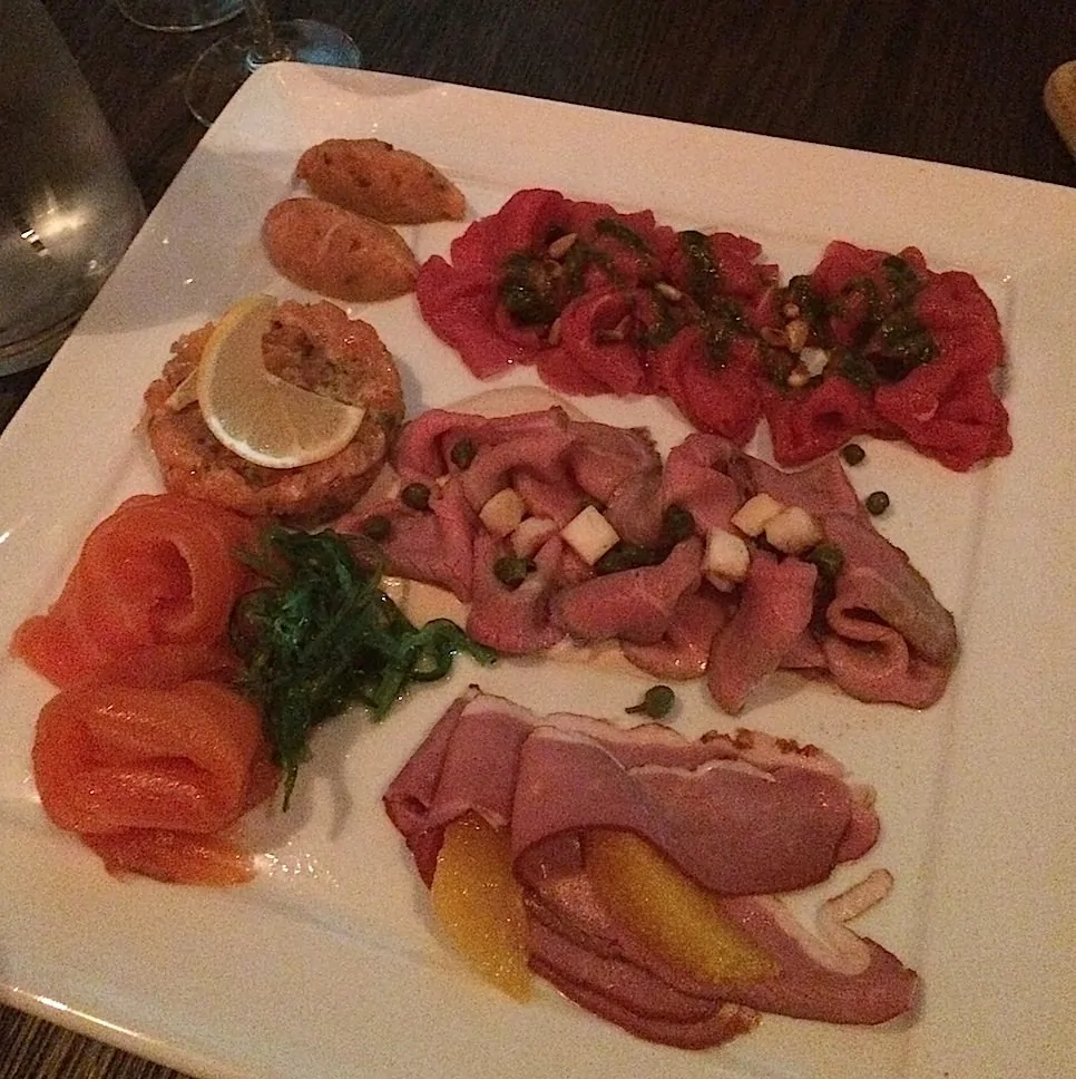Vooraf kregen we een combinatie van de vijf voorgerechten van het 3-gangen keuzemenu. Ik hoop dat de foto jullie net zo doet watertanden als het mij nog steeds doet, want dit was echt werkelijk fantastisch. Het voorgerecht bestond uit gerookte zalm, zalmtartaar en zalmmouse, carpaccio, vitello tonato, eendenborst en een espressokopje uiensoep. Al deze voorgerechten waren uitstekend, maar de ‘Trio van Zalm’ sprong er wat mij betreft boven uit. Geweldige kwaliteit zalm en mooie, pure smaken. Daar hou ik van! Voor een avondje romantisch dineren zouden mijn lief en ik dit zeker bestellen. Suggestie van ons: die mag zeker op de kaart!