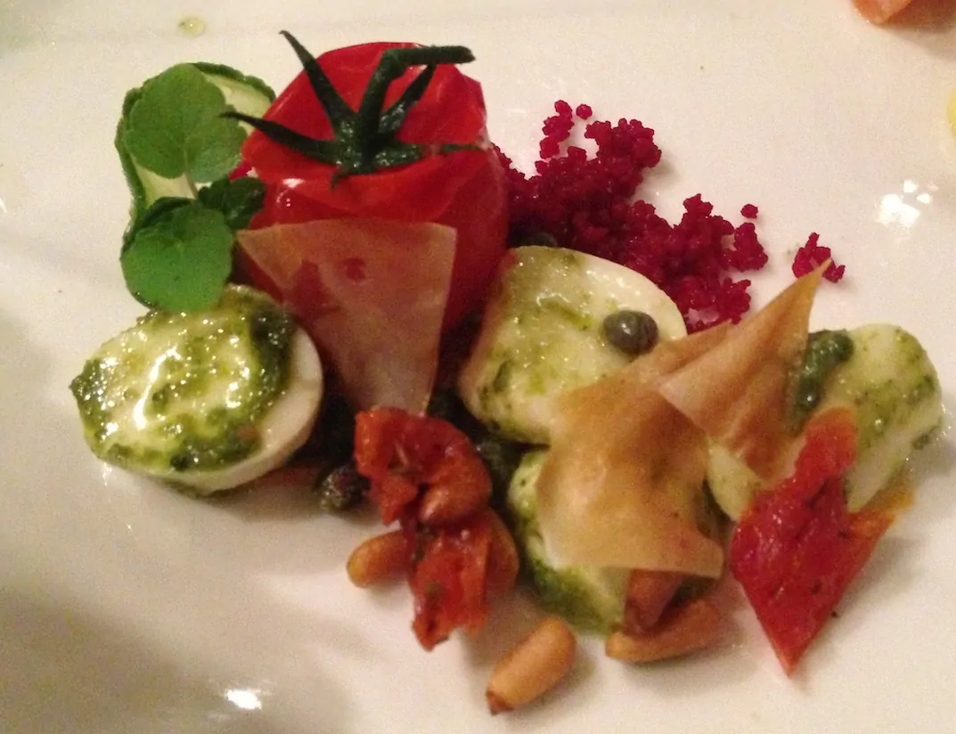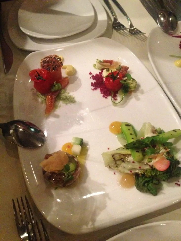 Aangezien ik geen zin had om een keuze te maken uit de kaart en graag wilde proeven wat de chef in huis had, wilde ik graag de ‘Rondreis door de kaart’. Een door de chef samengesteld menu met verschillende gerechten in voor-, tussen- en hoofdgerecht vorm voor € 32,- per persoon. Wat trouwens helemaal geen geld is…wacht maar tot je ziet wat we daarvoor kregen. Maar mijn tafelgenote is een wat meer kieskeurige eter. Zo eet ze ongeveer nooit vis en zijn er ook wat vleessoorten die geen voorkeur hebben. Maar een rondreis door de kaart is alleen per tafel te bestellen. En dan gaan we natuurlijke lastige vragen stellen die perfect werden beantwoord. Want dat was allemaal geen probleem, wij kregen gewoon de rondreis en de chef hield rekening met onze wensen. Top, daar worden de dames blij van.
