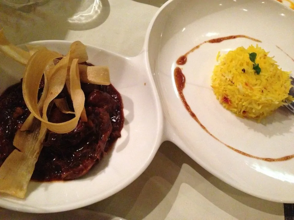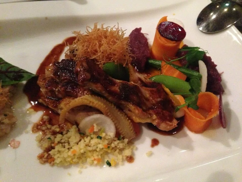 Een aantal visgerechten van B0&Ro op de kaart zijn de zalm met kerrie, sesam kletskop en rivierkreeftjes (€ 12), in knoflook gebakken tijgergarnalen met chili dressing en balsamico (€ 9) en kingcrab met appel en avocadocrème (€ 15). Qua vlees hebben ze onder andere in saffraan gemarineerde lamshaas met rode uien compote (€ 13), op lage temperatuur gegaard runderstaartstuk (€ 13) en (my favourite!) de kip in granaatappelsaus met walnoten, saffraanrijst en Perzische bessen (€ 12). Ook voor de vegetarische mens wordt goed gezorgd met bijvoorbeeld de Thaise groene asperges met little gem en mostermunt dressing (€ 8).